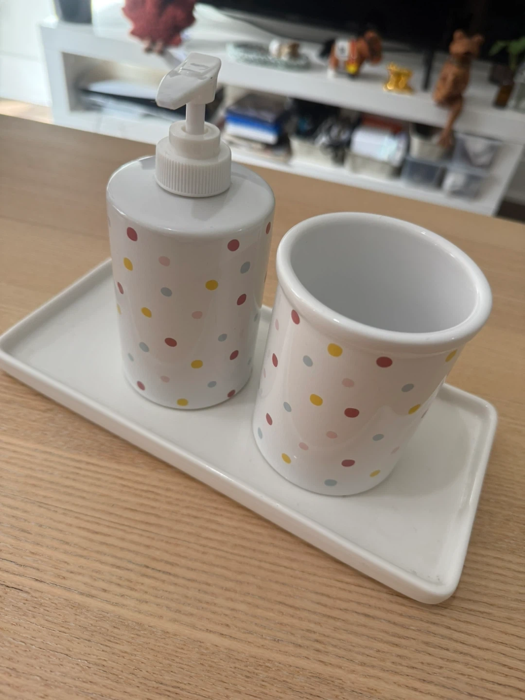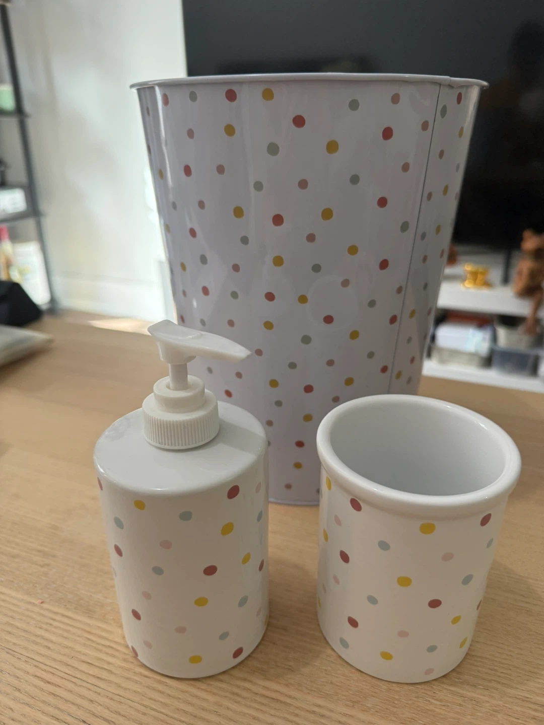 This set includes a soap dispenser, a cup, a tray and a bin. Set was purchased from Indigo.