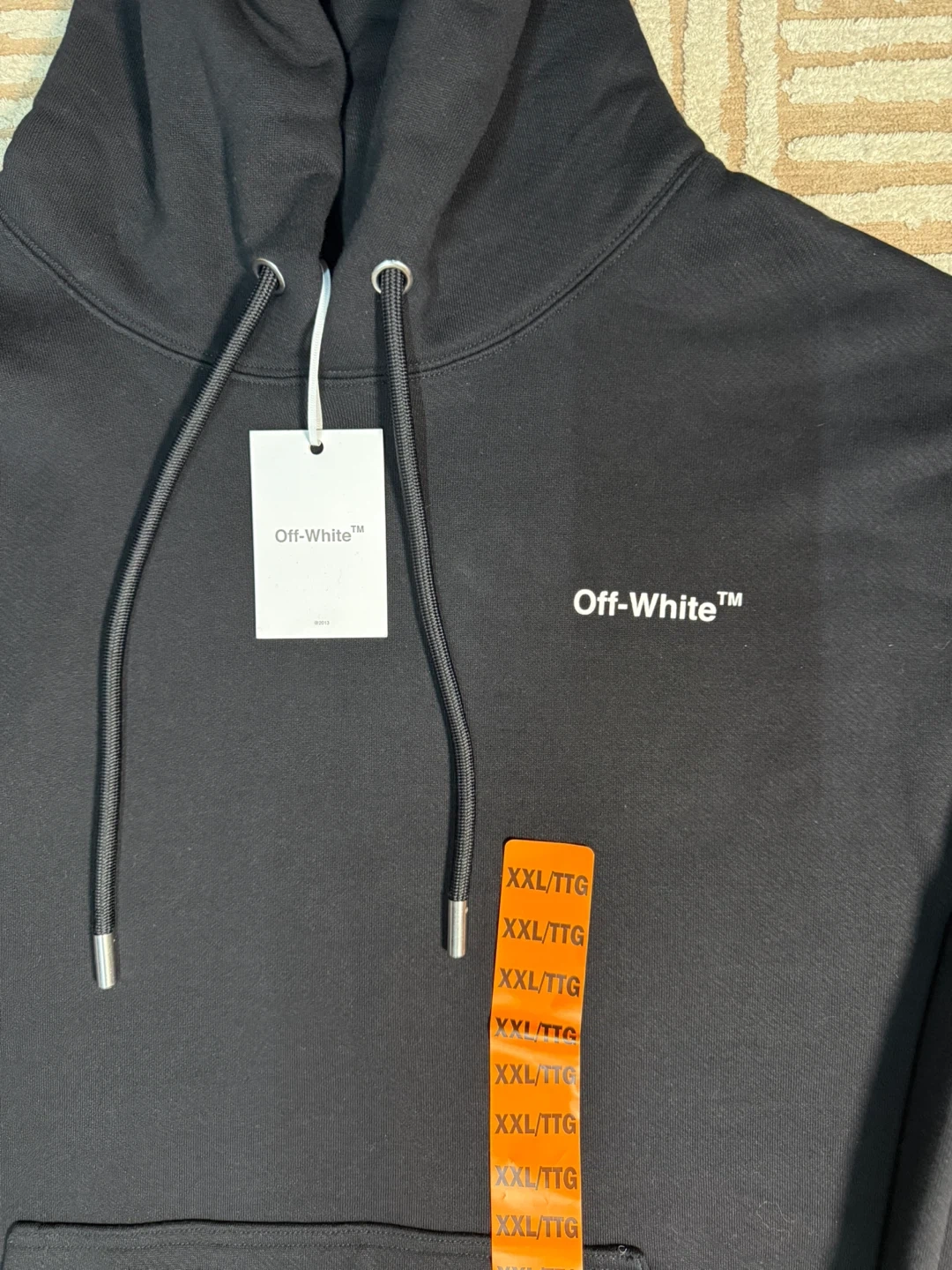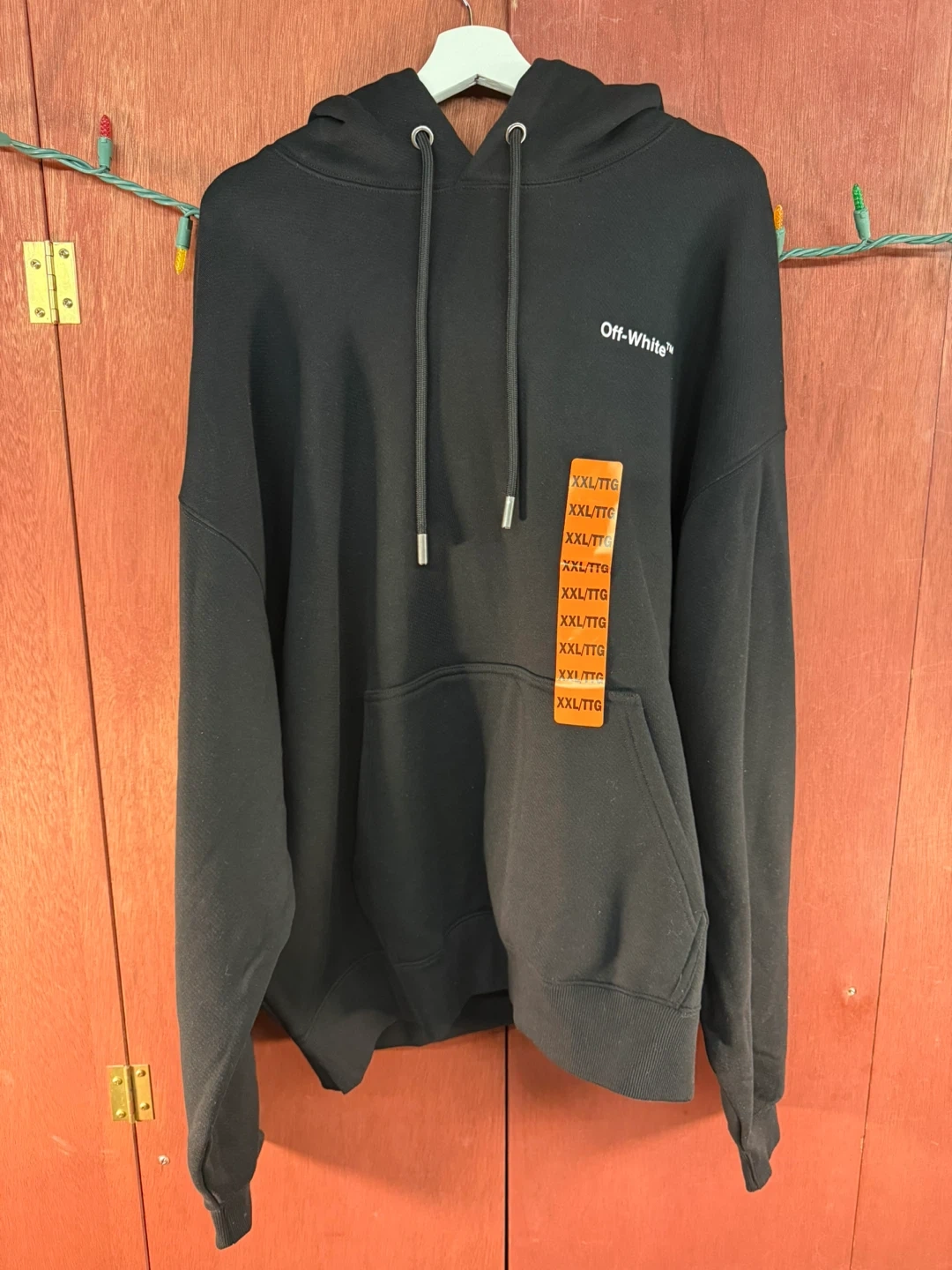 Selling a new Off-White men's pullover oversized fit hoodie in black, size XXL, perfect for a relaxed and stylish look.