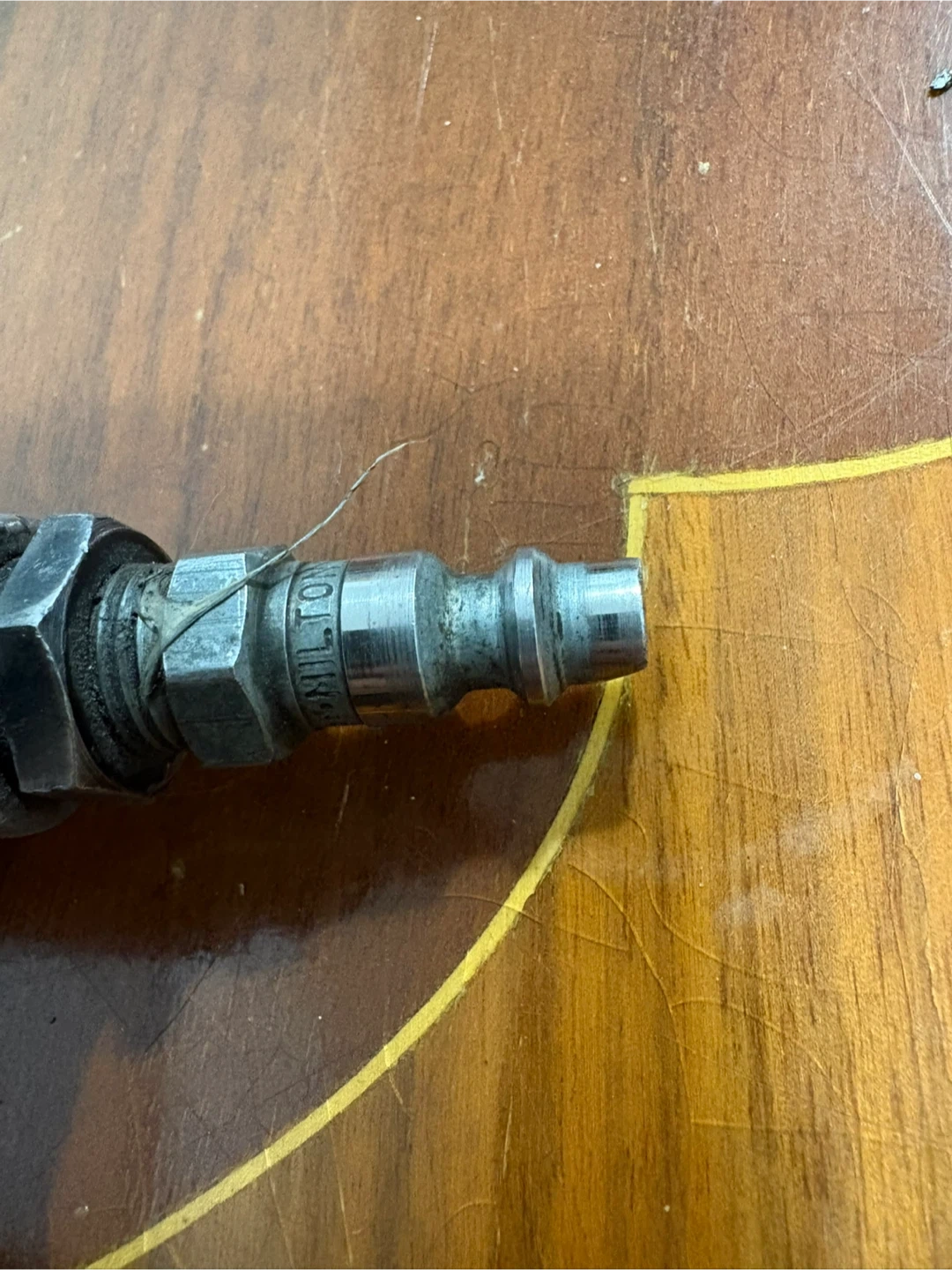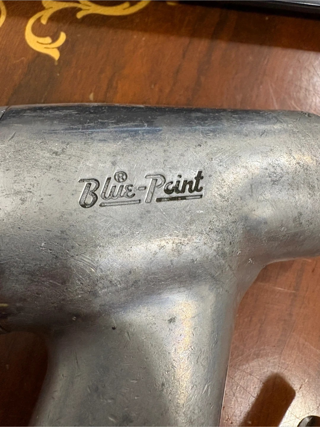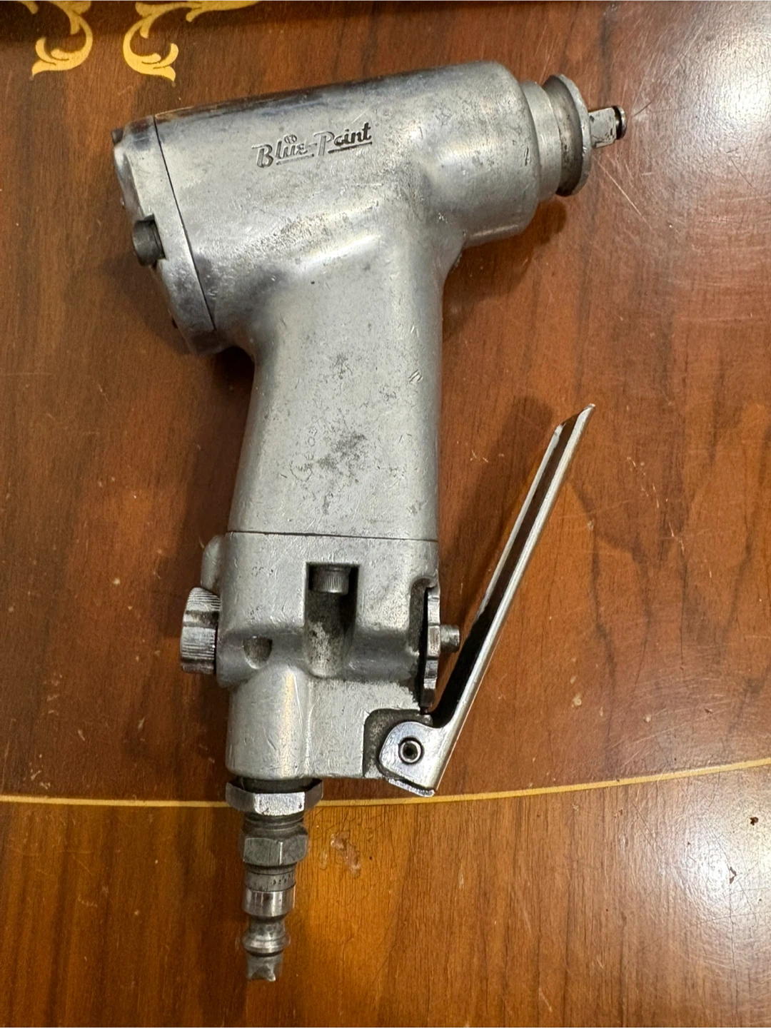Blue-Point AT300B air ratchet wrench. Features a metal body with a trigger handle. Includes air hose fitting. It's a handy tool for tight spaces!