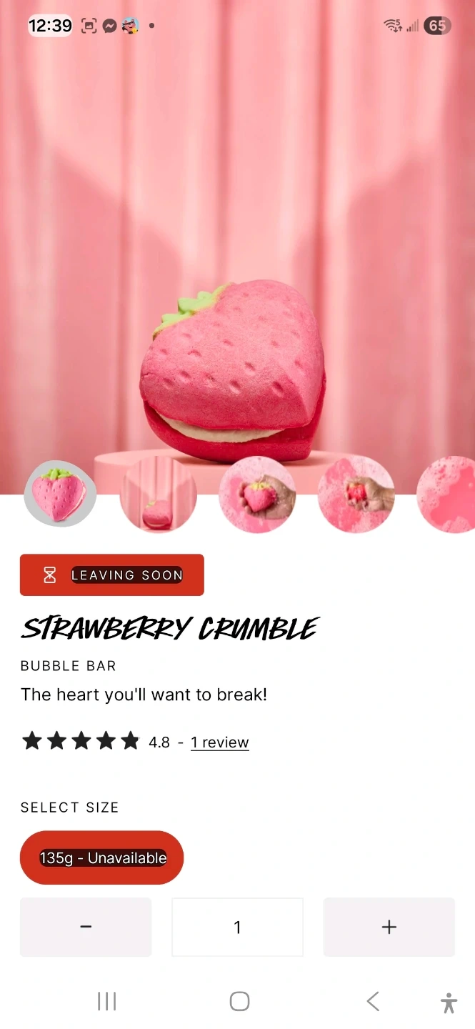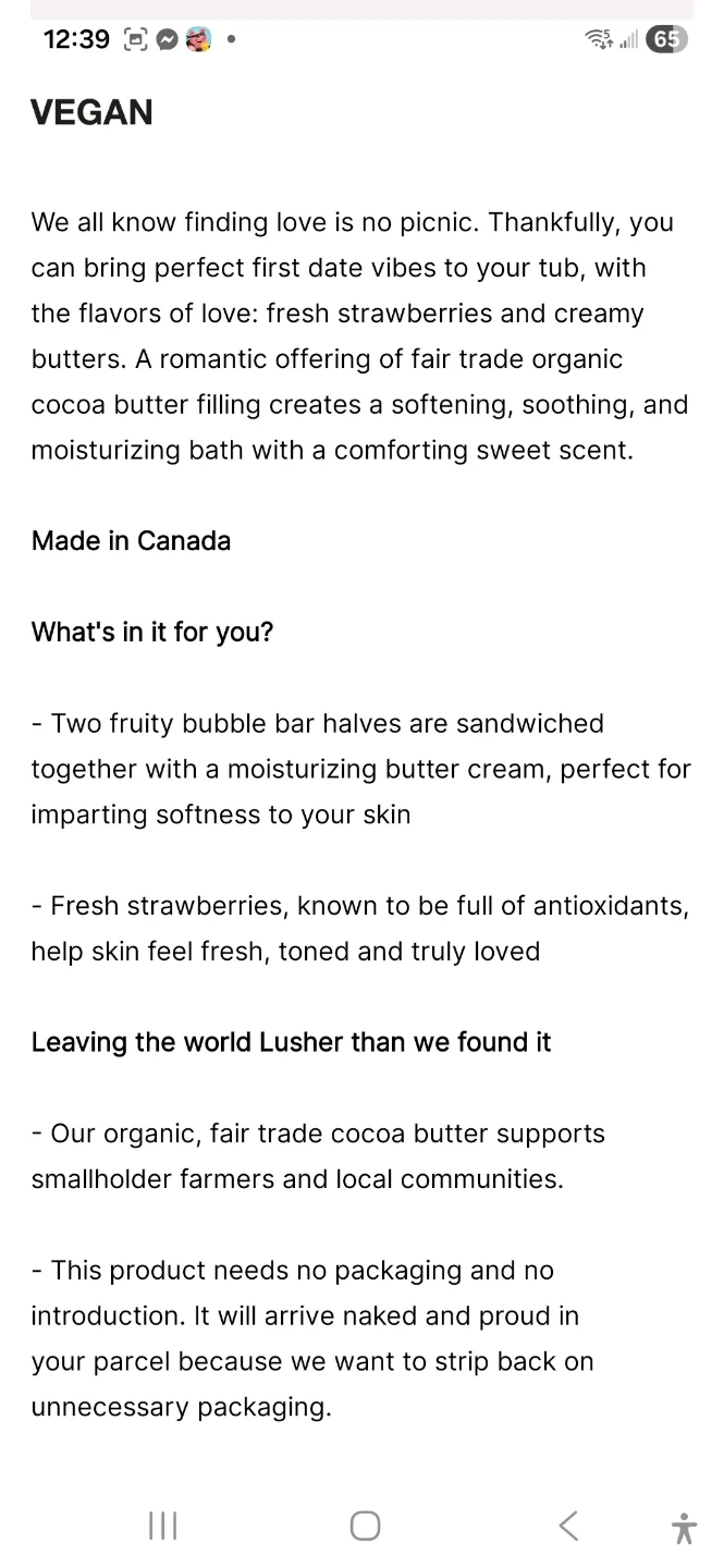 This is the Lush Strawberry Crumble bubble bar, made in Canada. It's a romantic offering of fair trade organic cocoa butter filling that creates a softening, soothing, and moisturizing bath with a comforting sweet scent. Two fruity bubble bar halves are sandwiched together with a moisturizing butter cream for imparting softness. Fresh strawberries, known to be full of antioxidants, help skin feel fresh, toned, and truly loved.