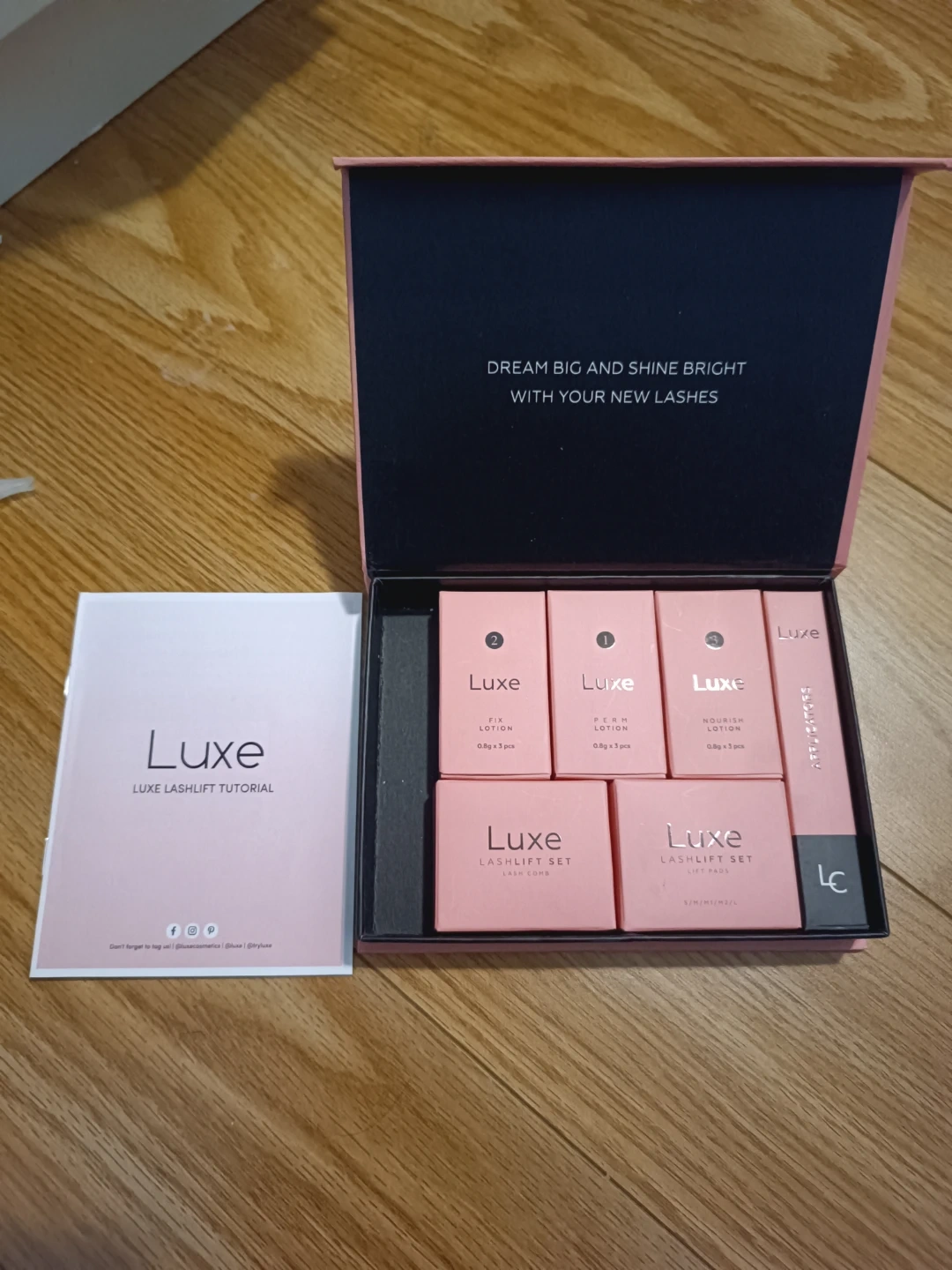 This is a Luxe Lashlift Set for creating beautiful lashes. It includes perm lotion, fixing lotion, and nutrition lotion. Instructions are also included.
