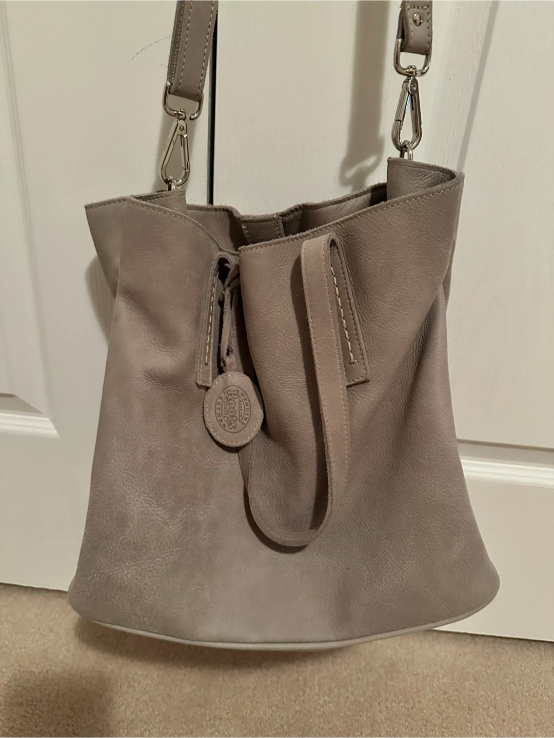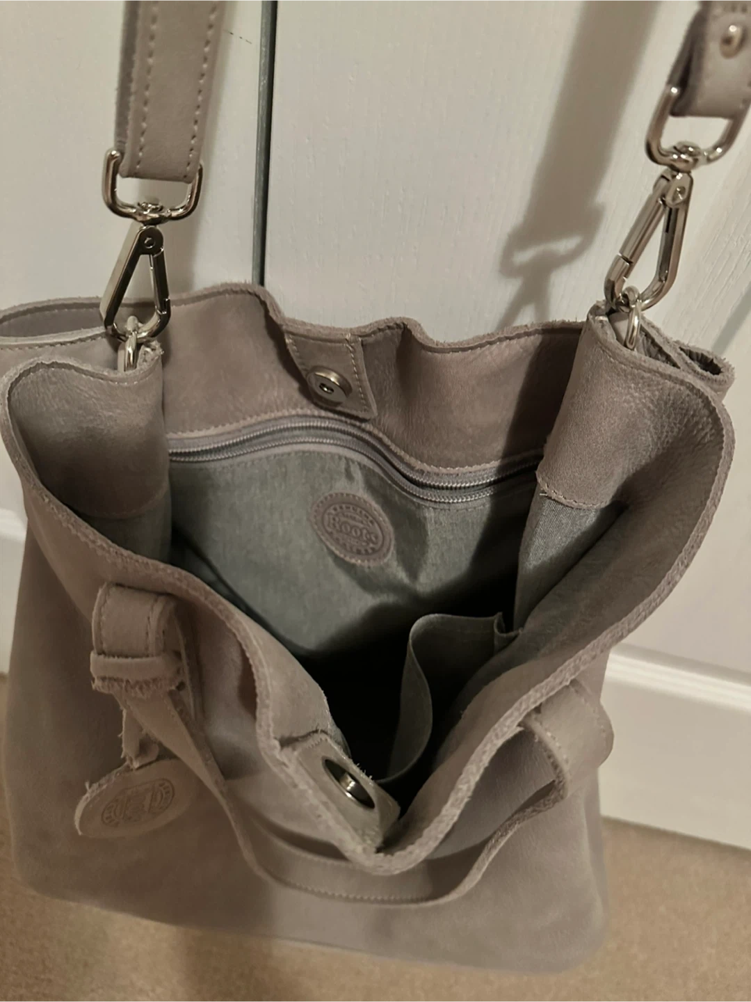 Stylish light grey Roots leather shoulder bag. It's made from soft suede and features a drawstring closure with a shoulder strap and carry handles. Cash and pick up.