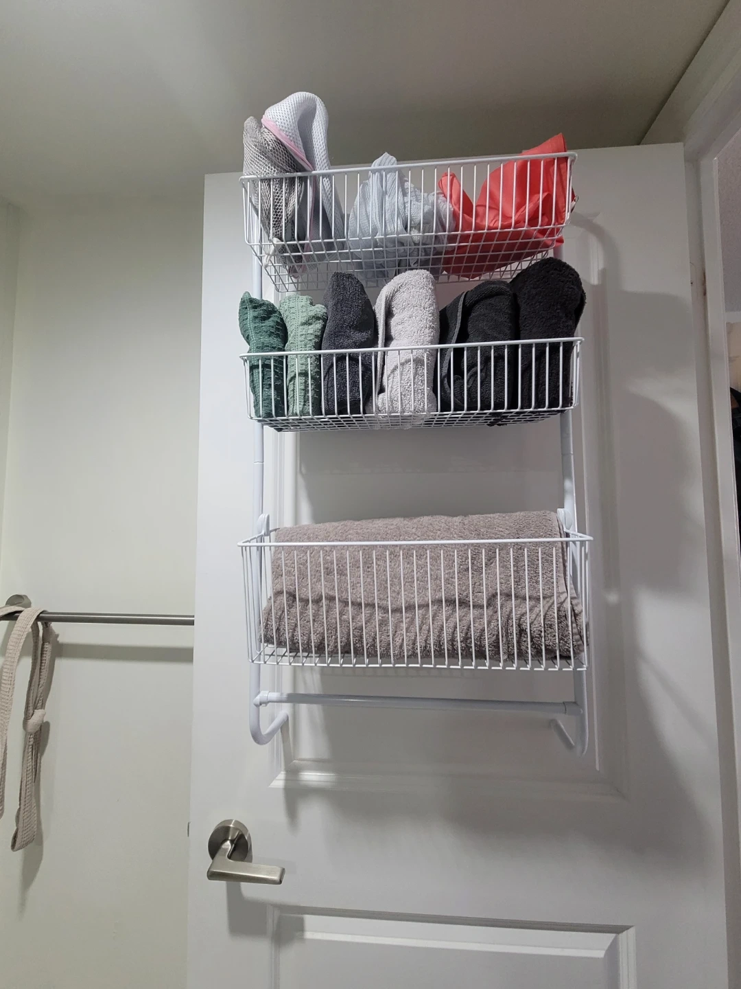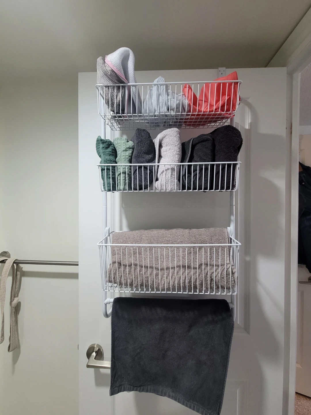 It's designed to hang over a door, perfect for storing towels, socks, underwear or other essentials.
