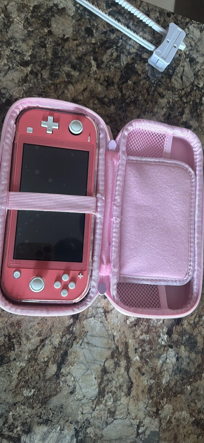 Coral Nintendo Switch Lite gaming console! It's in its pink unicorn case, which has a soft interior to keep it protected. This setup is ready for gaming on the go. Great for young gamers!