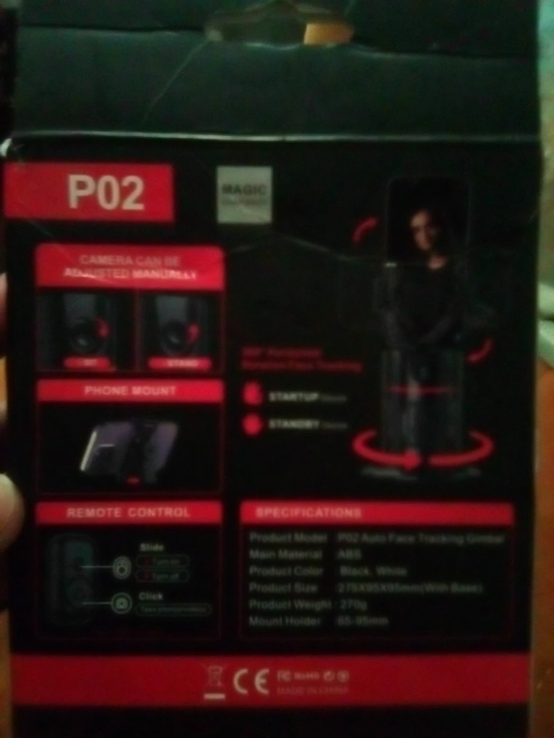 This is the P02 Auto Face Tracking Gimbal. It includes a phone mount and has a 1/4 screw interface. The main material is ABS and it weighs 270g. The mount holder fits 65-95mm. Perfect for capturing hands-free video!