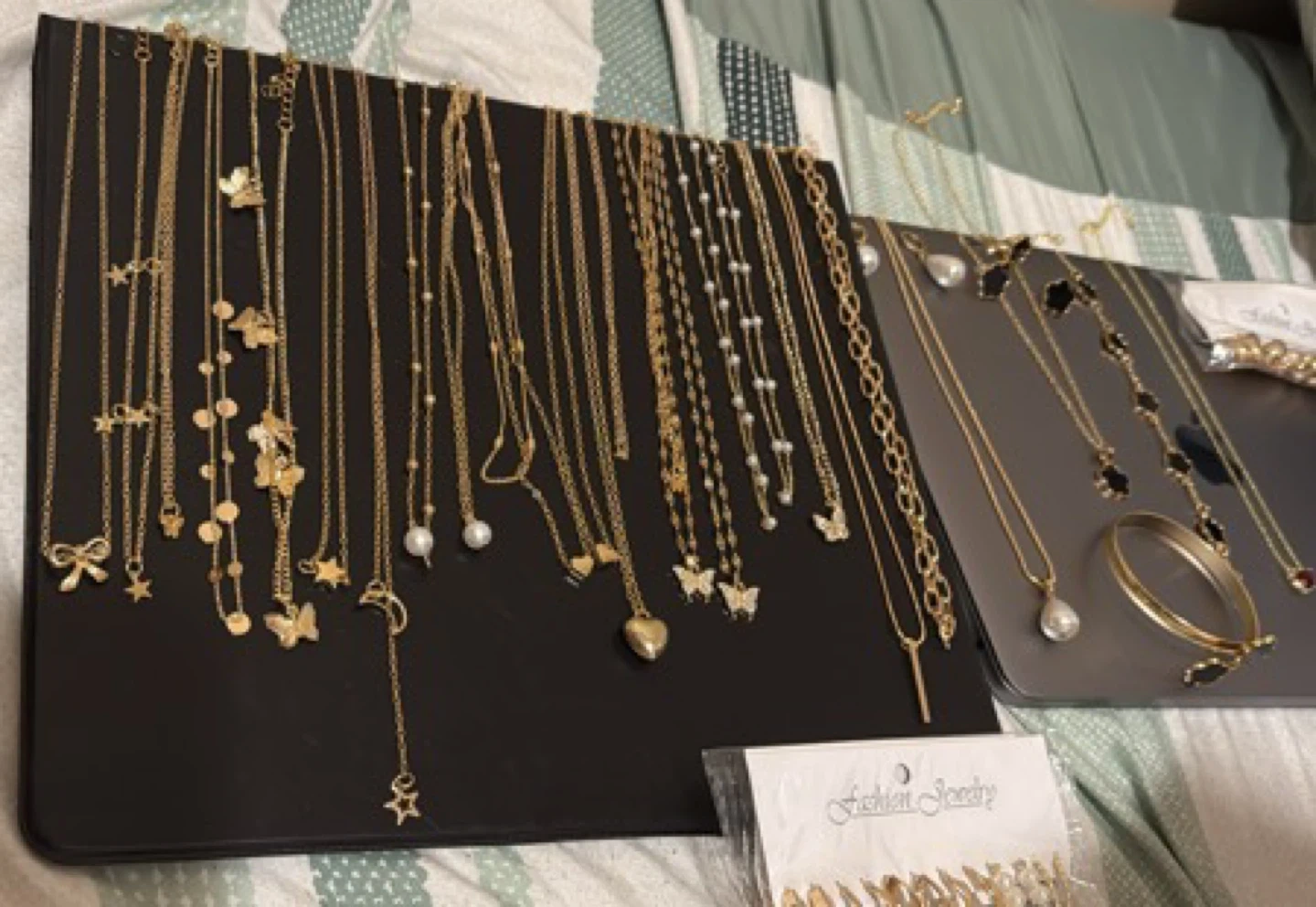 Selling a collection of gold-tone fashion jewelry! Includes a variety of necklaces with different charms like butterflies, hearts, stars, and moons. There's also a set of earrings in their original packaging.its sell by each pair.