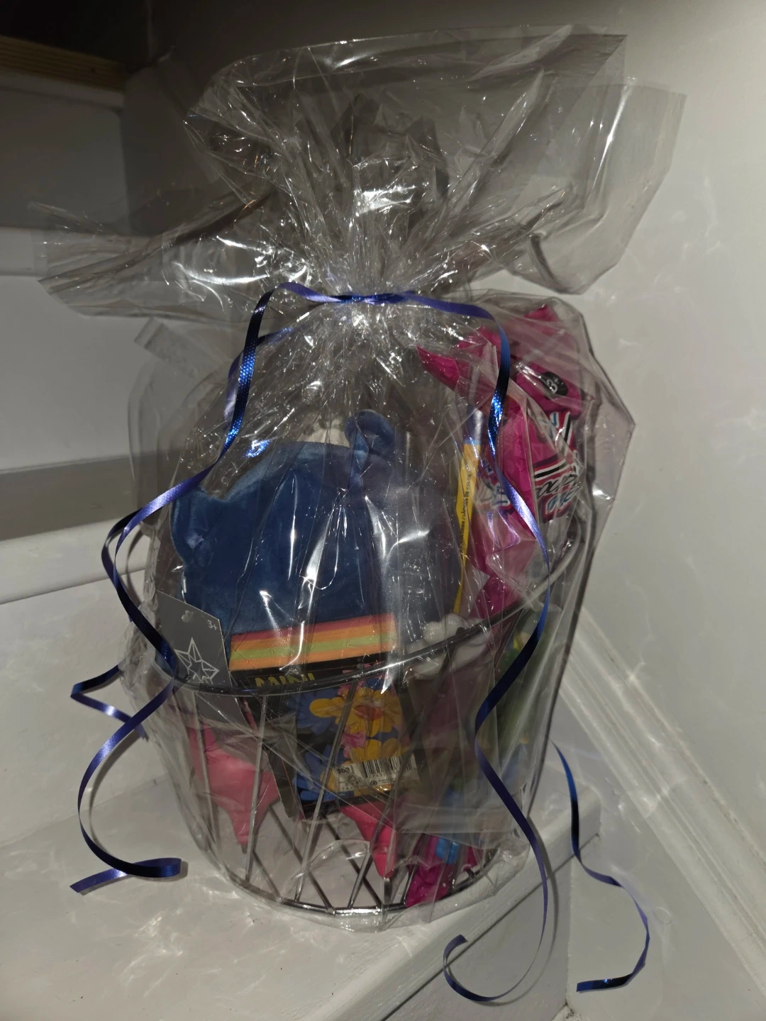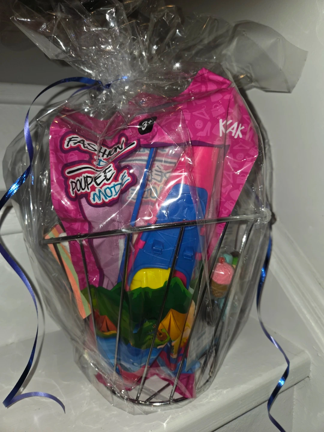 This gift basket is packed with toys and essentials for a child. It includes "Fashion Poupee Mode" items, a stuffed animal, pink ice skates, and oral hygiene products like toothbrushes and crafts. It's a fun assortment for a young one!