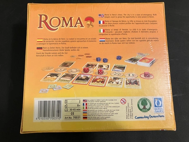 Brand new, factory sealed copy of Roma — a classic 2-player strategy card game designed by Stefan Feld. The game is still in its original shrink wrap and has never been opened or played. In Roma, players compete as powerful leaders in ancient Rome, strategically activating character cards using dice to gain influence and reduce their opponent’s life total. Fast-paced, tactical, and highly replayable — a must-have for fans of tight 2-player strategy games. Game Details: Players: 2, Playing Time: 30–45 minutes, Ages: 12+, Designer: Stefan Feld. Condition: Brand new, Factory sealed, Never opened, Box in excellent condition. Perfect for collectors, Stefan Feld fans, or anyone looking to add a sealed copy of this modern classic to their collection. Let me know if you're interested!