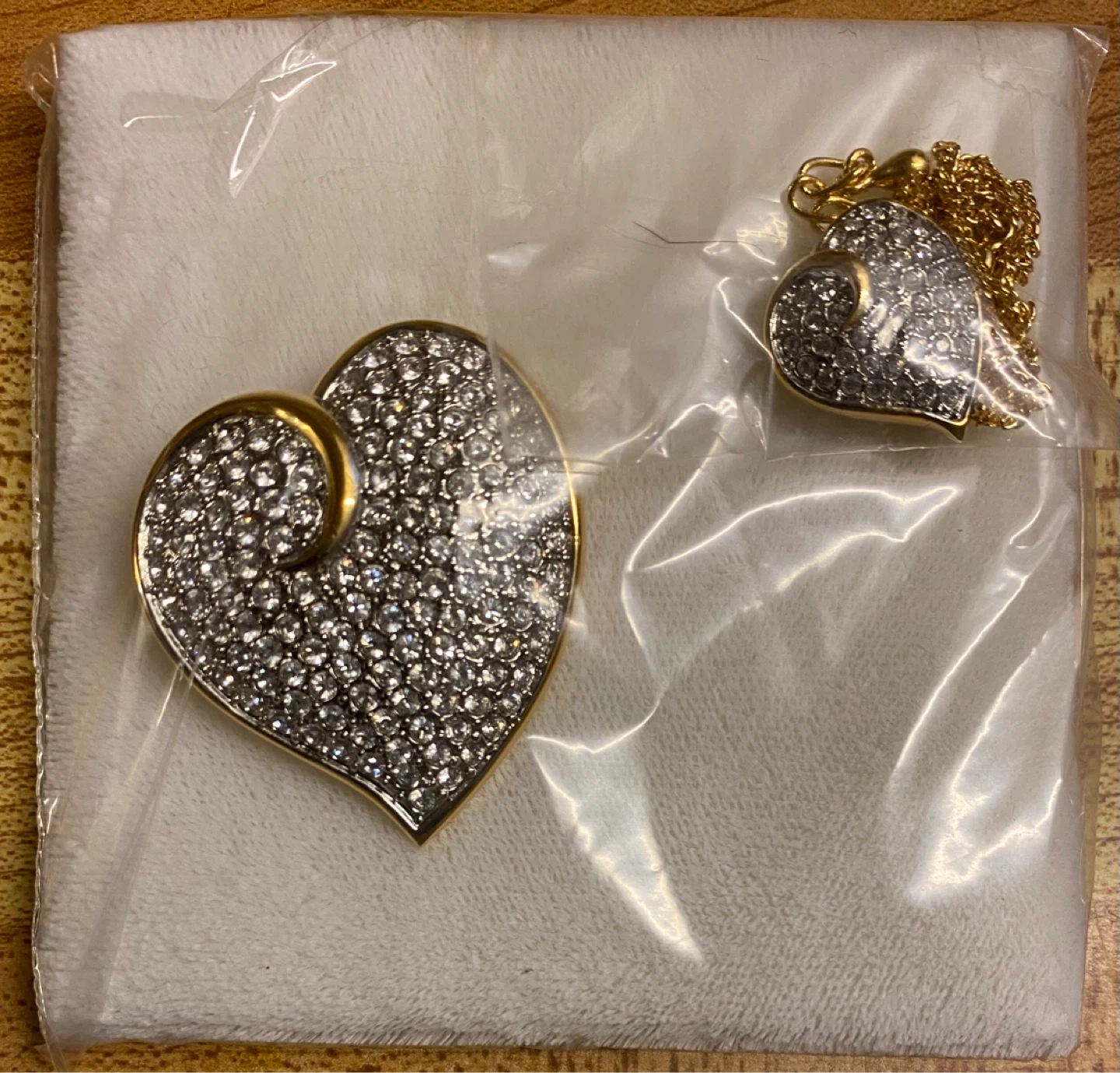 Sparkly heart-shaped pendant necklace and matching brooch. Both pieces are encrusted with clear rhinestones and feature a gold-tone trim. The necklace comes with a delicate gold-tone chain. A nice set for adding a touch of sparkle!