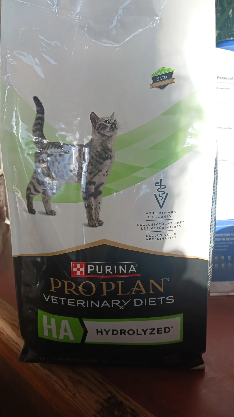 Purina Pro Plan Veterinary Diets HA Hydrolyzed dry cat food. This bag is 5.5 oz. It's formulated for cats with food sensitivities.