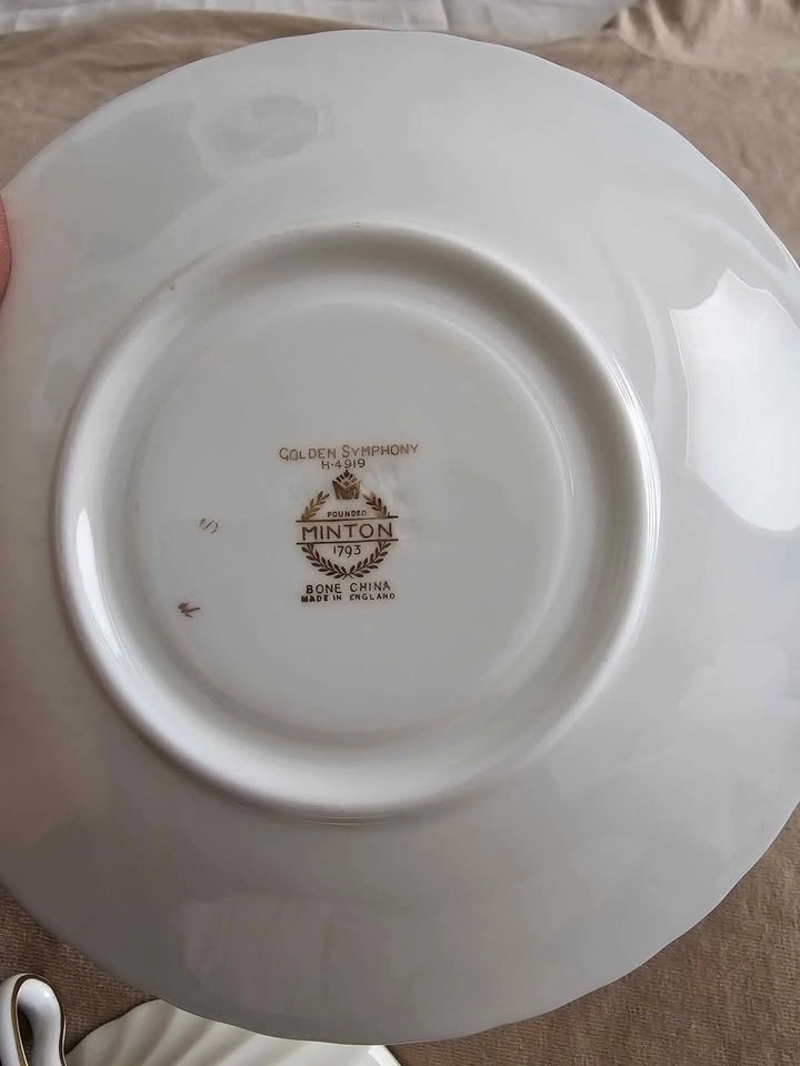 This sale is for one (1) ANTIQUE "Golden Symphony" H4919 Double Handled Soup Bowl With Saucer, Scalloped edge, Made In England circa 1942, discontinued, in 1970.