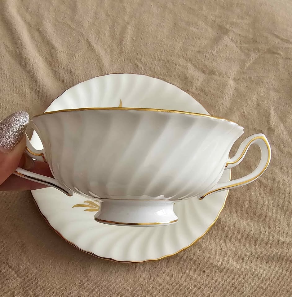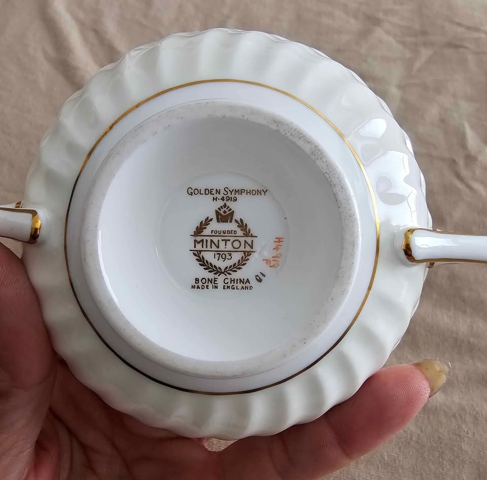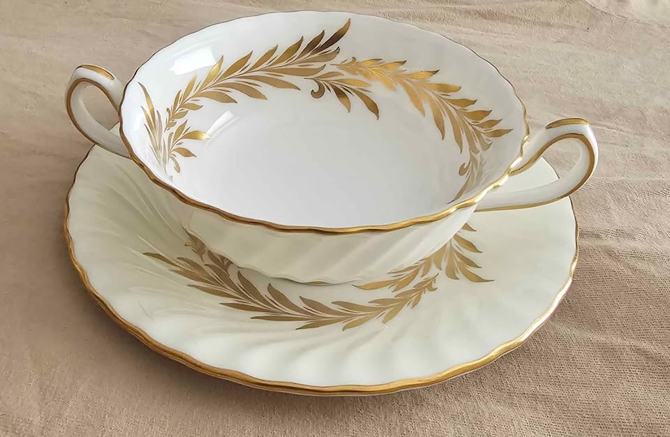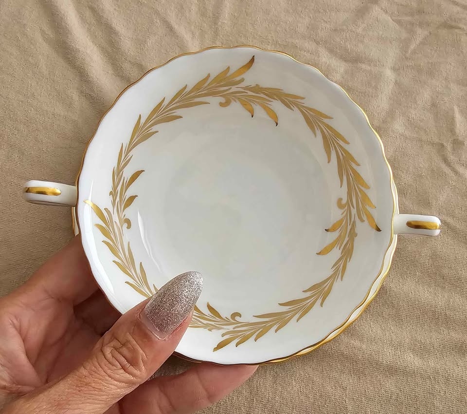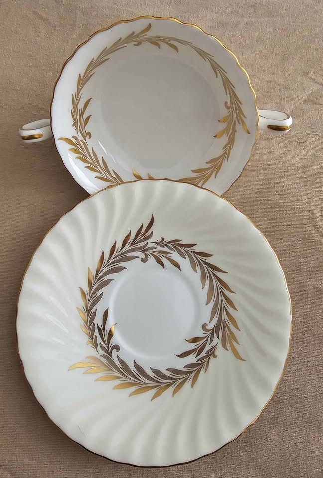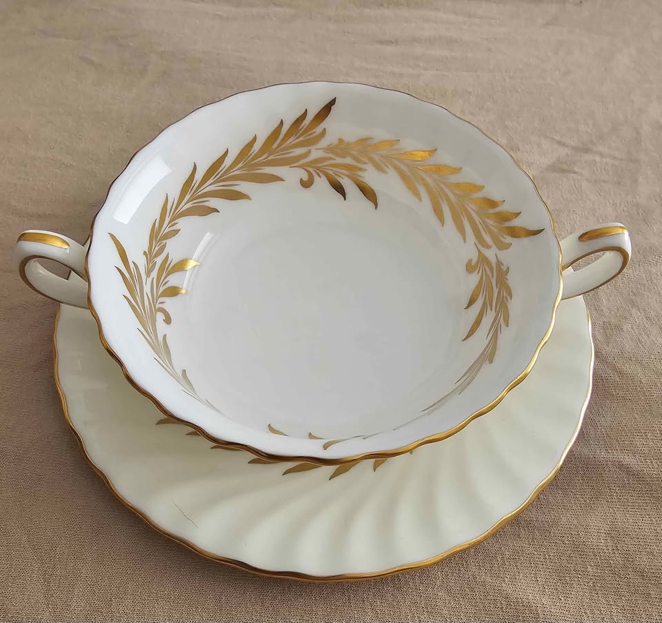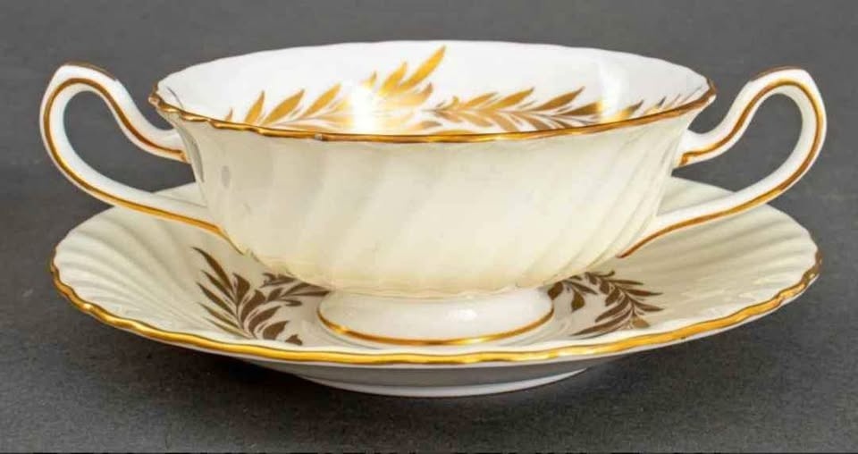 This sale is for one (1) ANTIQUE "Golden Symphony" H4919 Double Handled Soup Bowl With Saucer, Scalloped edge, Made In England circa 1942, discontinued, in 1970.