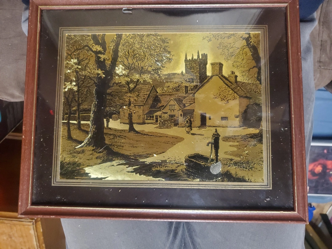 Antique framed picture. Gold leaf detailing. Depicts a quaint village scene. Dark wooden frame. Shows some wear.