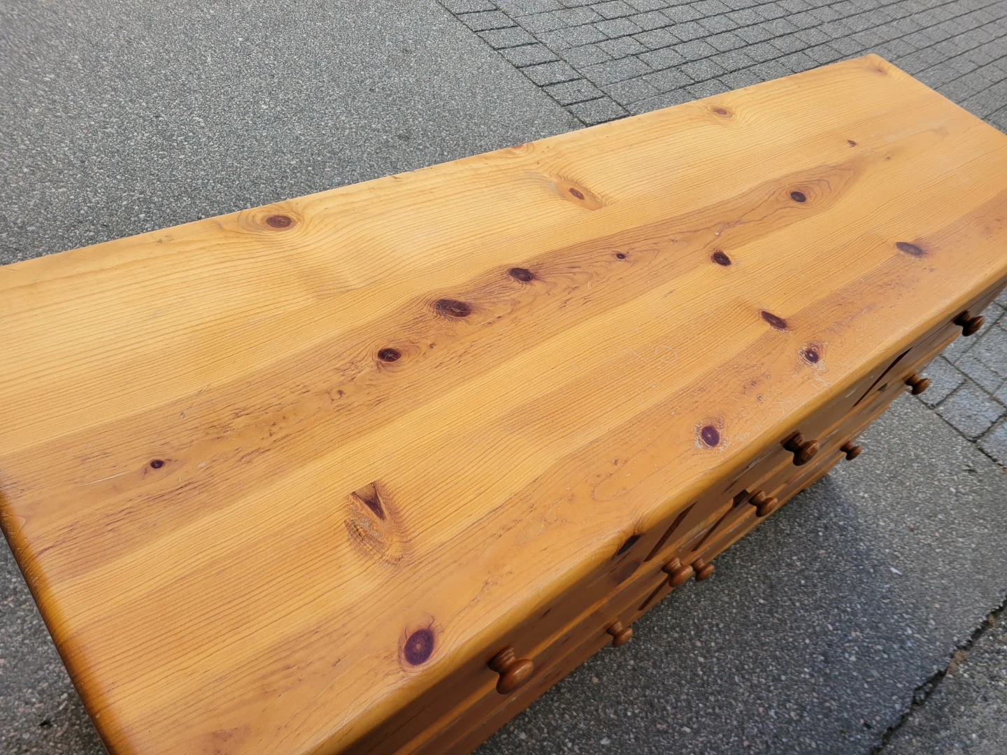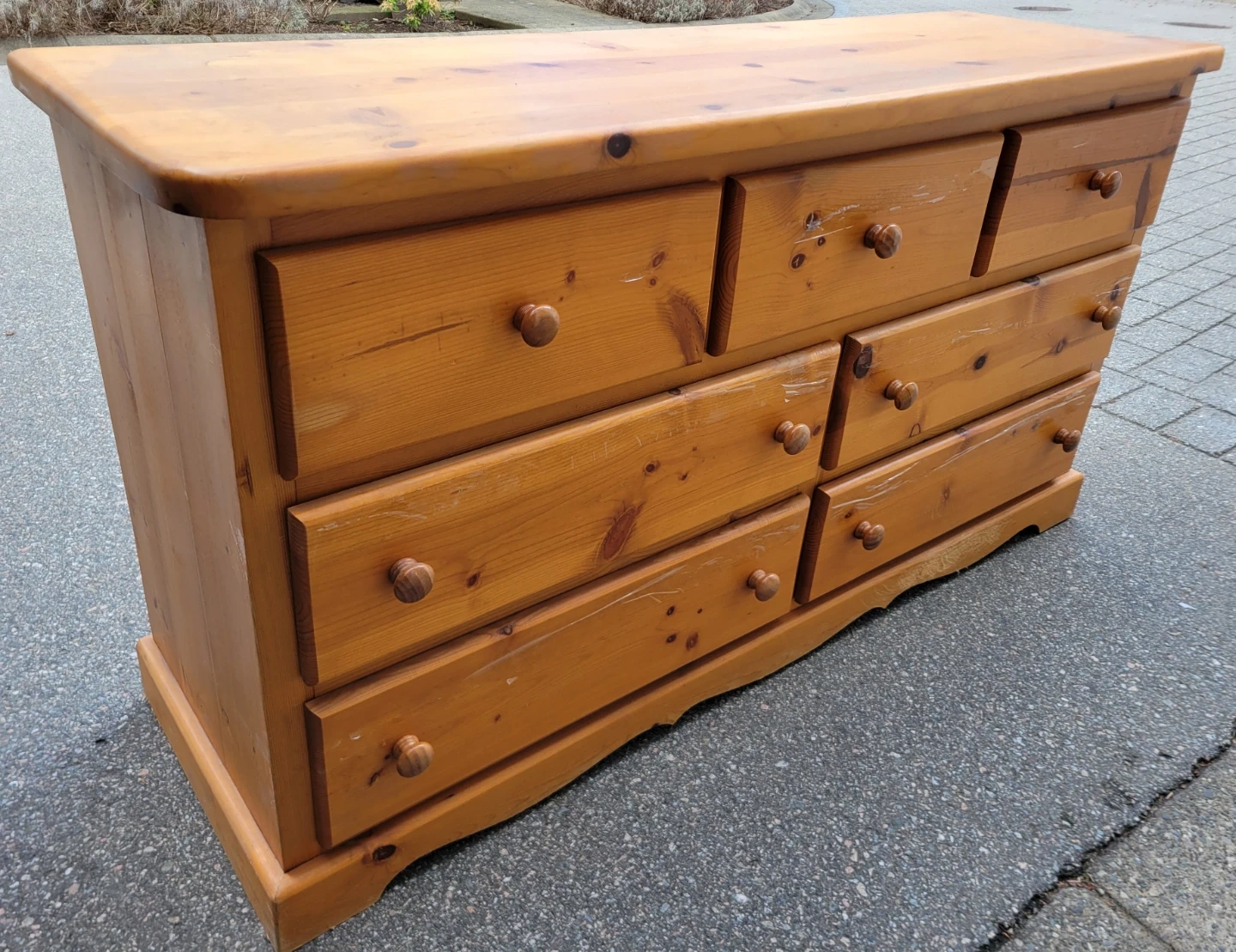 Wooden dresser with seven drawers. Dimensions are 57" W x 17.5" D x 30.5" H. Some tape residue visible on the wood. Delivery available if needed. Let me know if you are interested. Thanks.