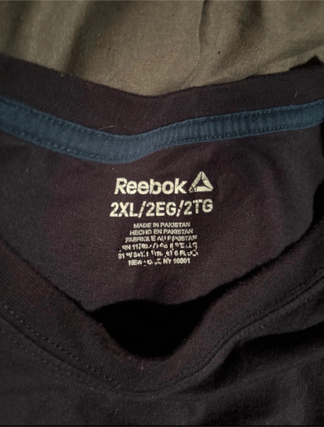 Looking to add a sporty touch to your wardrobe? I'm selling a Reebok T-shirt in size 2XL. This navy blue tee features the Reebok logo and is perfect for workouts or casual wear. It's in good condition and ready for a new home.