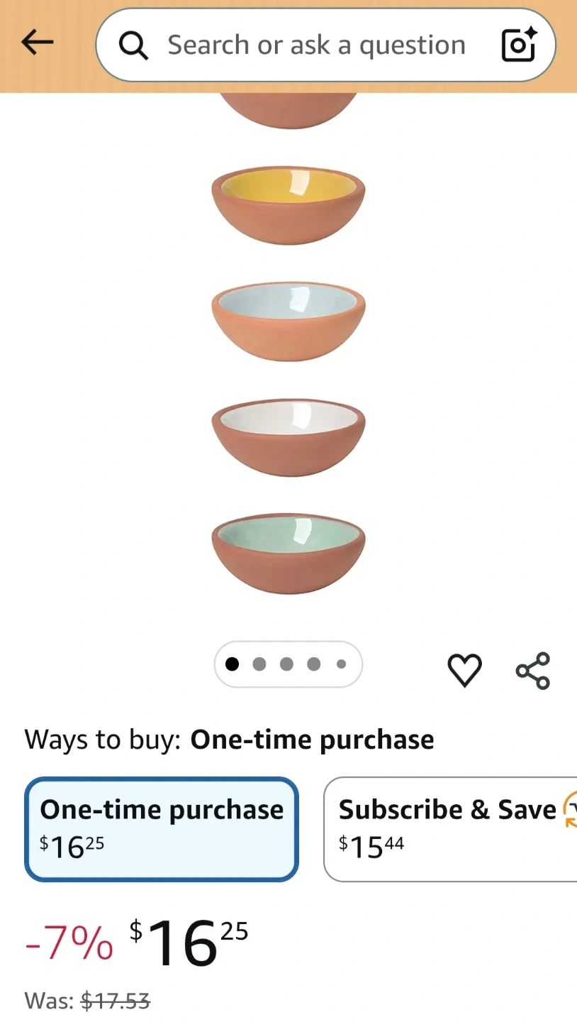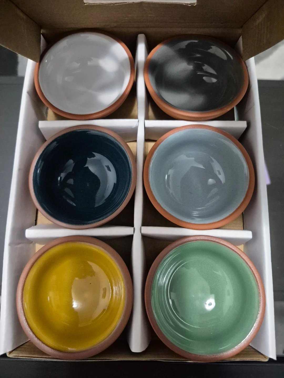 This is a set of six pinch bowls by Danica Heirloom. The bowls are made of terracotta and come in assorted colours including yellow, light blue, green, grey, dark blue, and black. These small bowls are perfect for spices, dips, or small snacks.