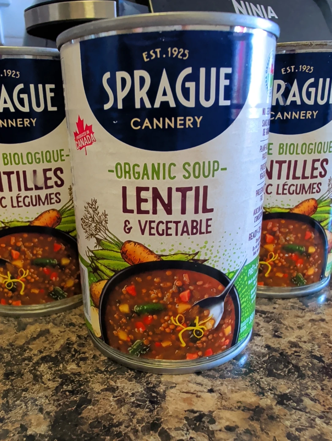 Sprague Canned organic Lentil & Vegetable soup. It's made with lentils and vegetables. This canned soup is ready-to-eat!