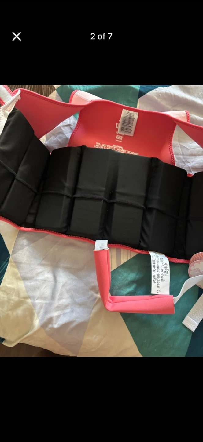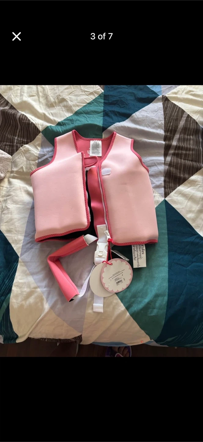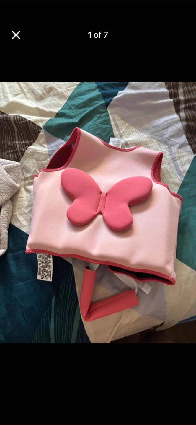 This pink swim vest is for ages 4-6 years and up to 30kgs. It's made of neoprene and polyester. It has a cute butterfly design on the back . Smoke free pet free home . Pick up 551 Emerson street . Coquitlam . Cash only.no delivery