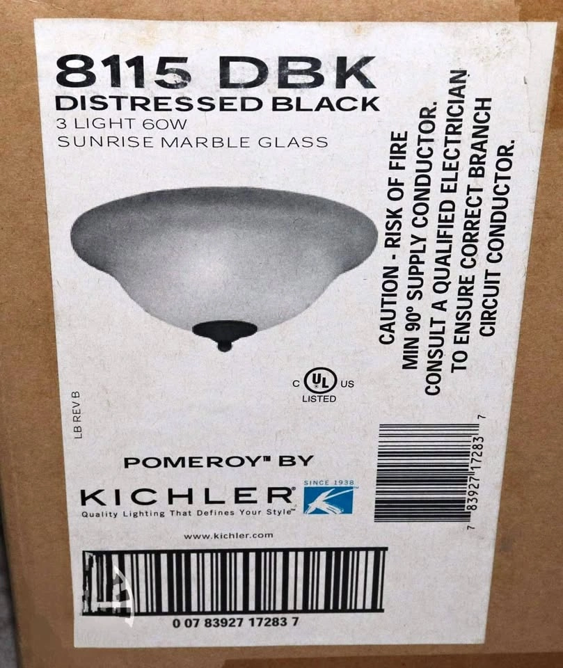 10KICHLER 8115DBK POMEROY 3 LIGHT FLUSH MOUNT, DISTRESSED BLACK FINISH WITH SUNRISE MARBLE GLASS