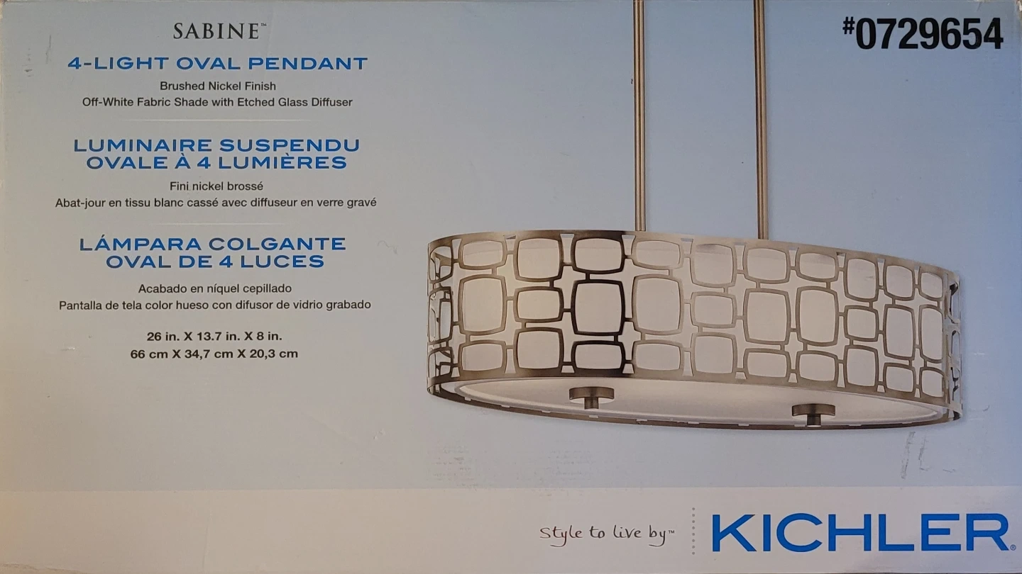 60Selling a Kichler Sabine 4-light oval pendant. It features a brushed nickel finish and an off-white fabric shade with an etched glass diffuser. Dimensions are 26 in x 13.7 in x 8 in (66 cm x 34.7 cm x 20.3 cm)