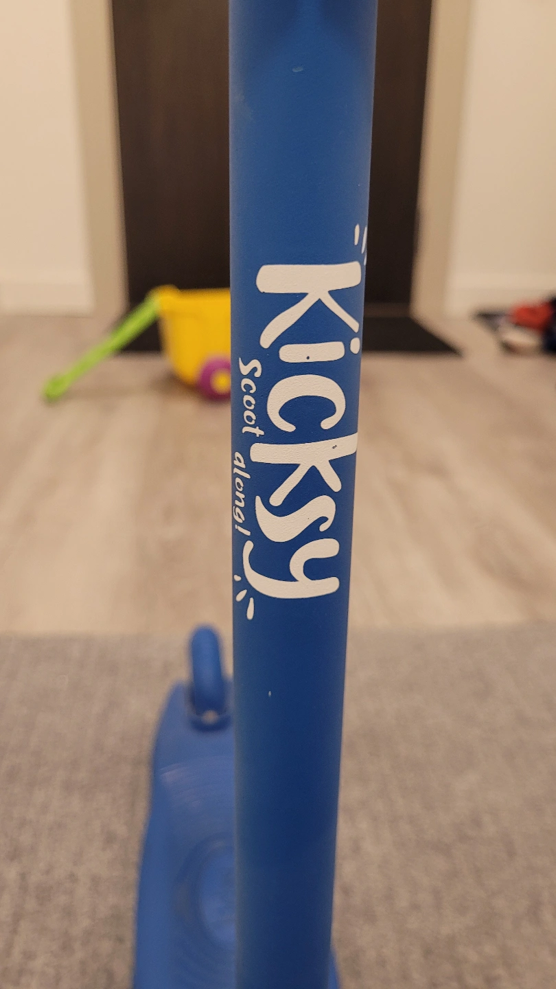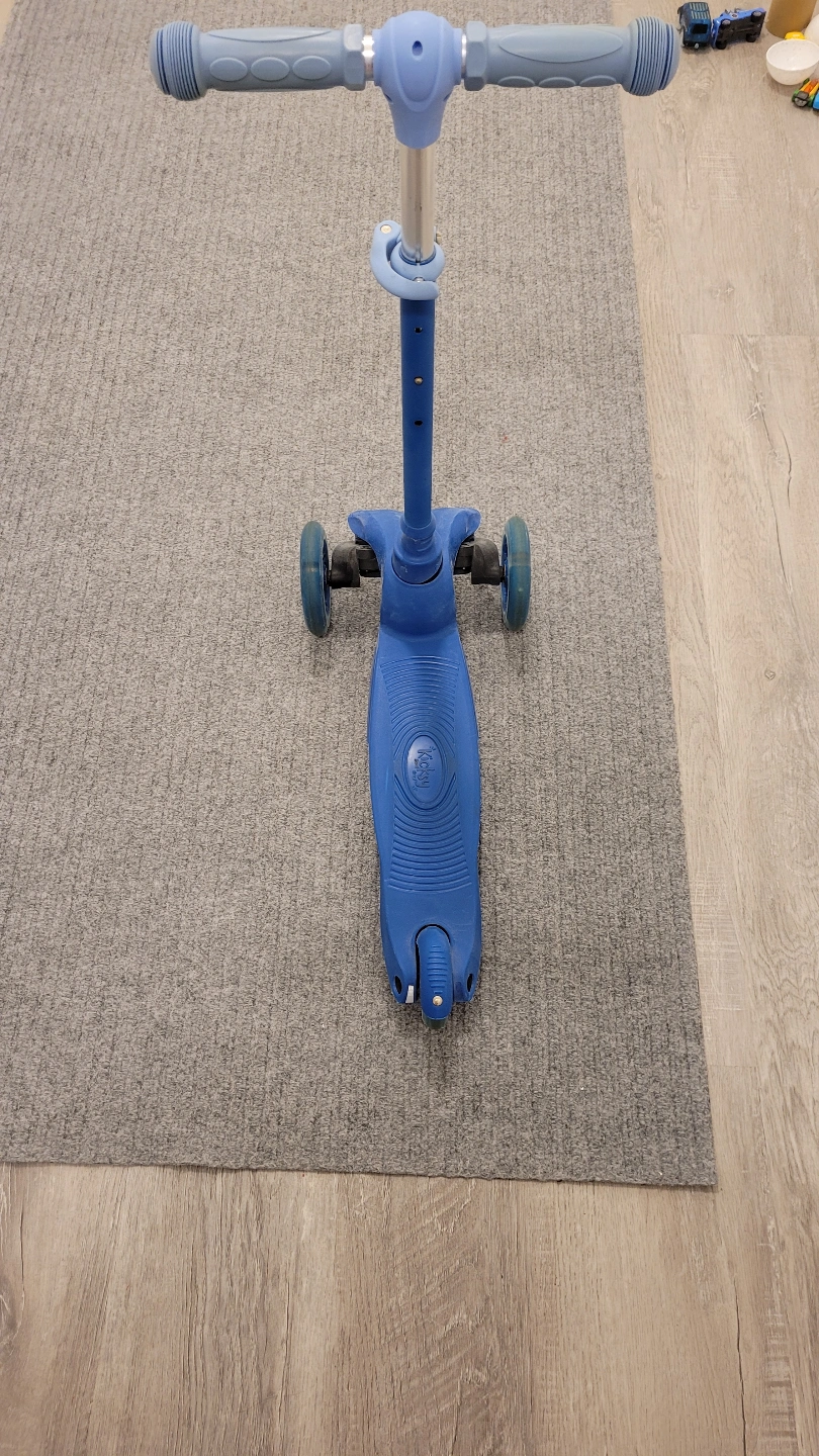 Blue kids scooter. Three wheels. Adjustable height. Wheels light up when moving, Good used condition.