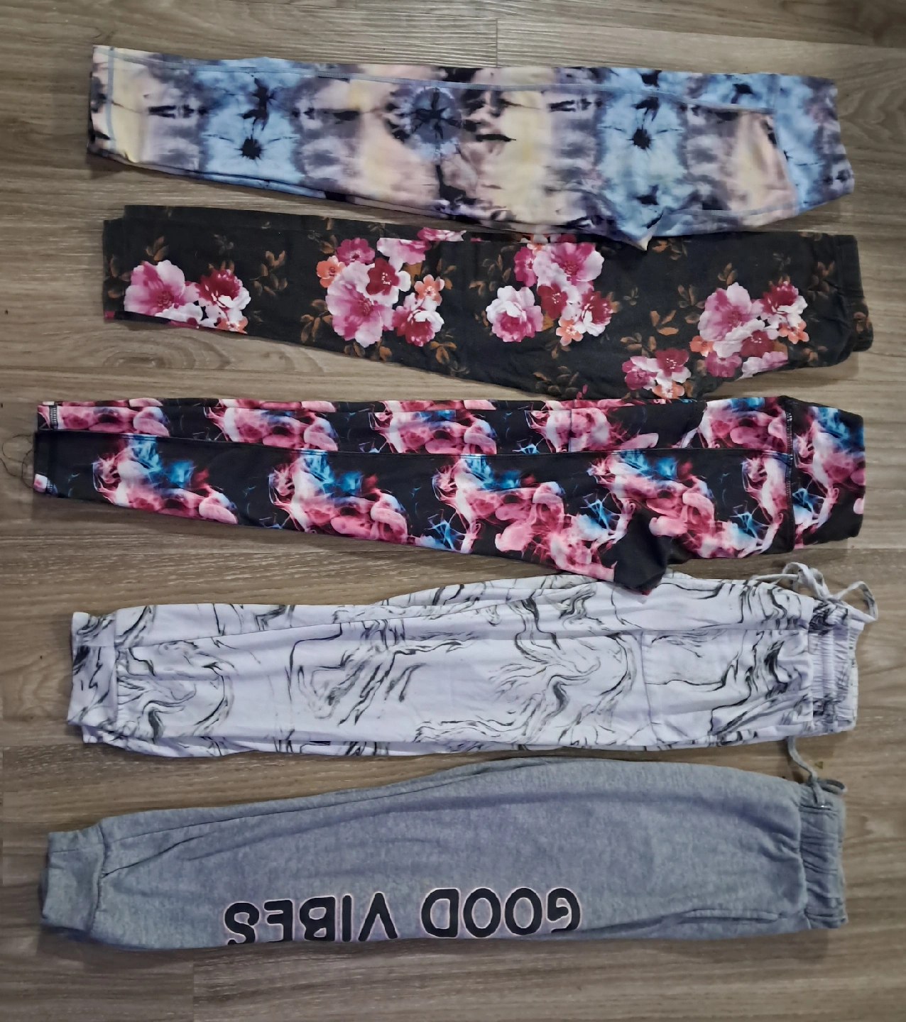 10Selling a set of assorted girls pants. There are five pairs in total with various patterns and colours. They are all in great condition and super comfy for lounging around the house!