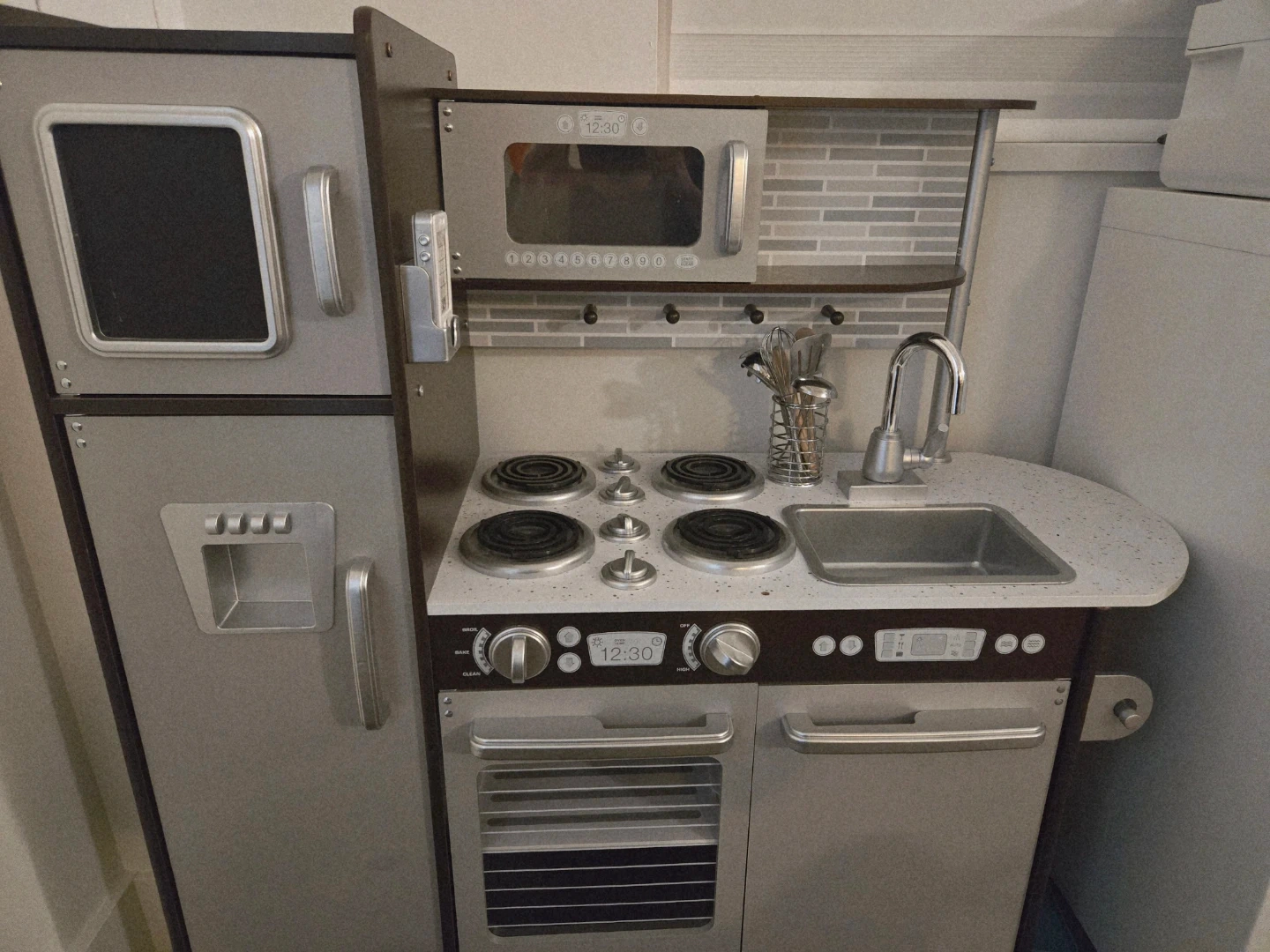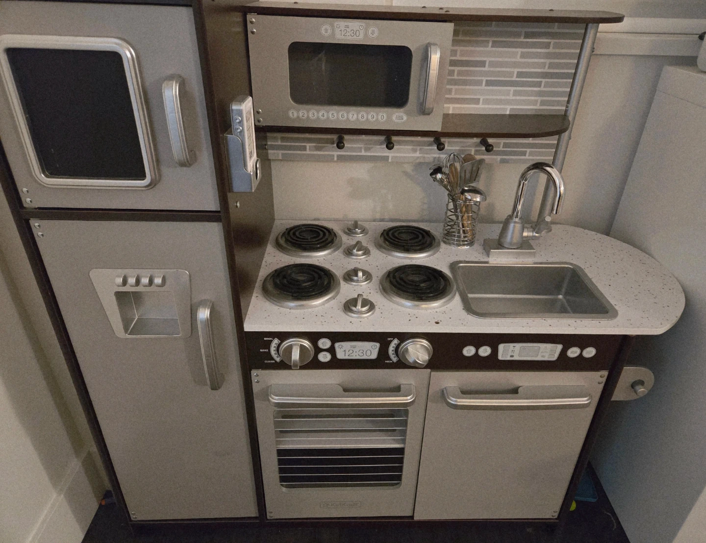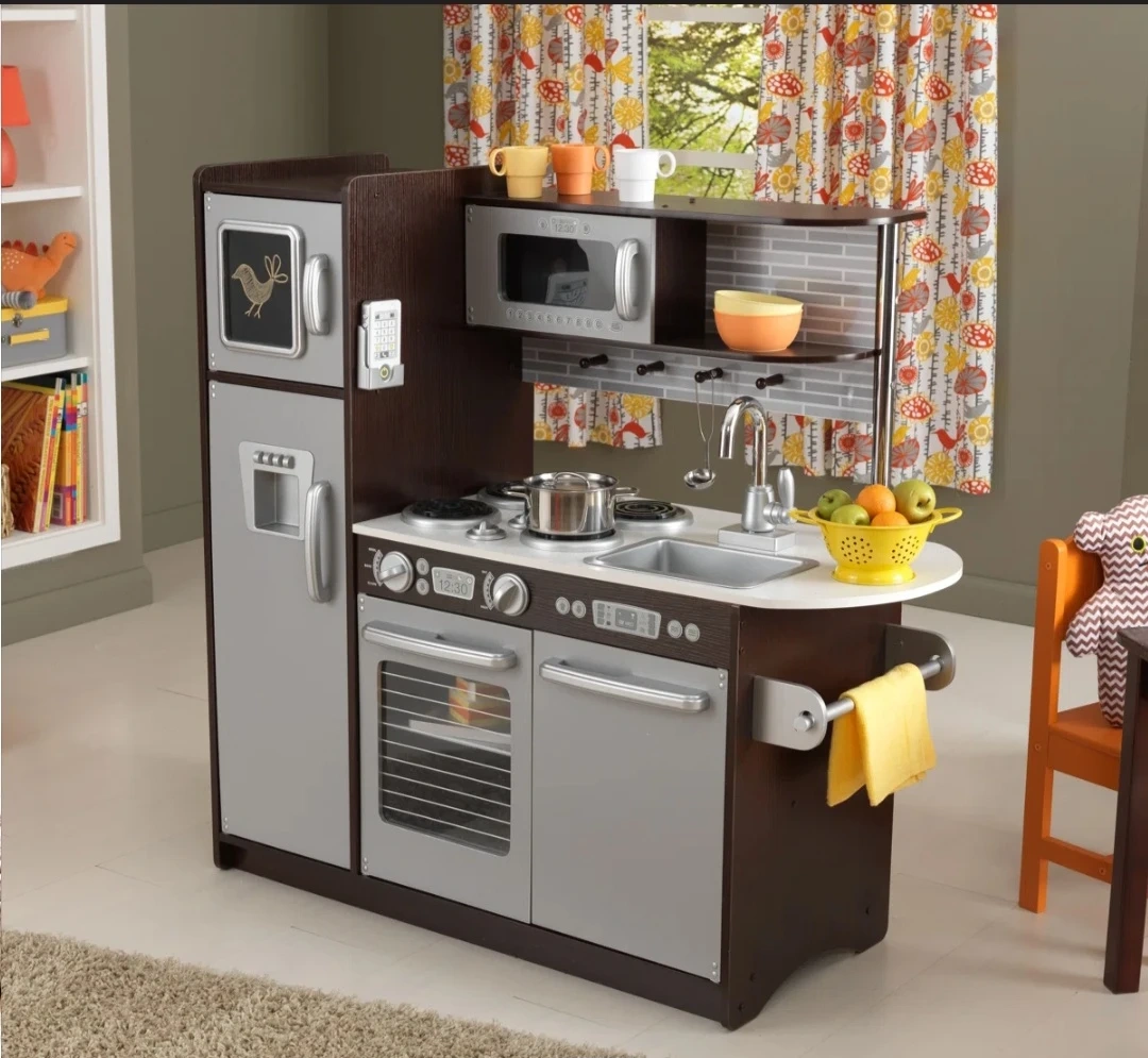 65This is a KidKraft play kitchen, perfect for your little chef! It features a refrigerator, microwave, oven, and sink. The kitchen is in great condition and ready for hours of imaginative play About This Product KK1877 Time to cook up a little fun! Our KidKraft Uptown Kitchen Set has a hip, modern look that young chefs are sure to love. With tile-look backsplash and sleek countertops, the design is emulated from trendy real-life kitchens. Every appliance is interactive, including doors that open and close, knobs that turn and click, and a working chalkboard on the freezer door. Kids will love taking calls on the cordless play phone that attaches to the side of the refrigerator. Keep all accessories neat and handy with the pegs for hanging utensils and the side towel rack. Crafted from composite wood, the Uptown contemporary kitchen is a sturdy and stylish addition to playtime. Included: pots and pans The refrigerator, freezer, microwave, oven, and dishwasher doors all open and close. Shelving for pots, pans, and accessories. The chalkboard surface on the freezer. Packaged with detailed, step-by-step assembly instructions. Large enough that multiple children can play at once Convenient storage space above the sink Removable sink for quick and easy cleaning