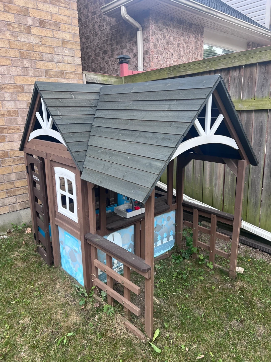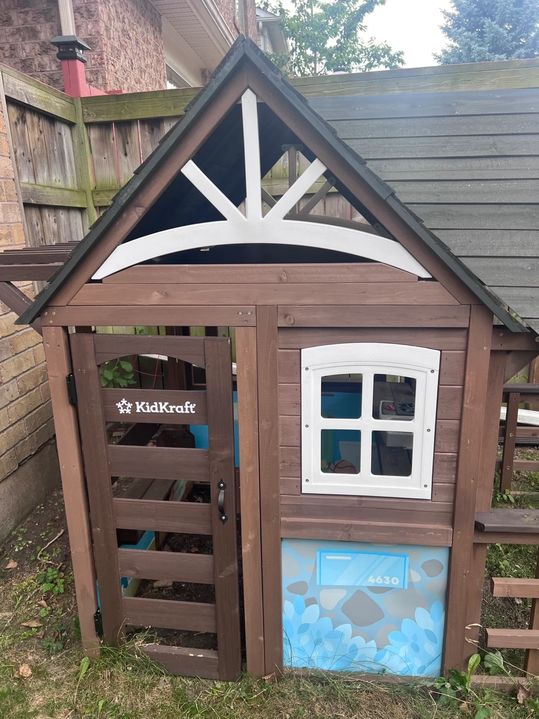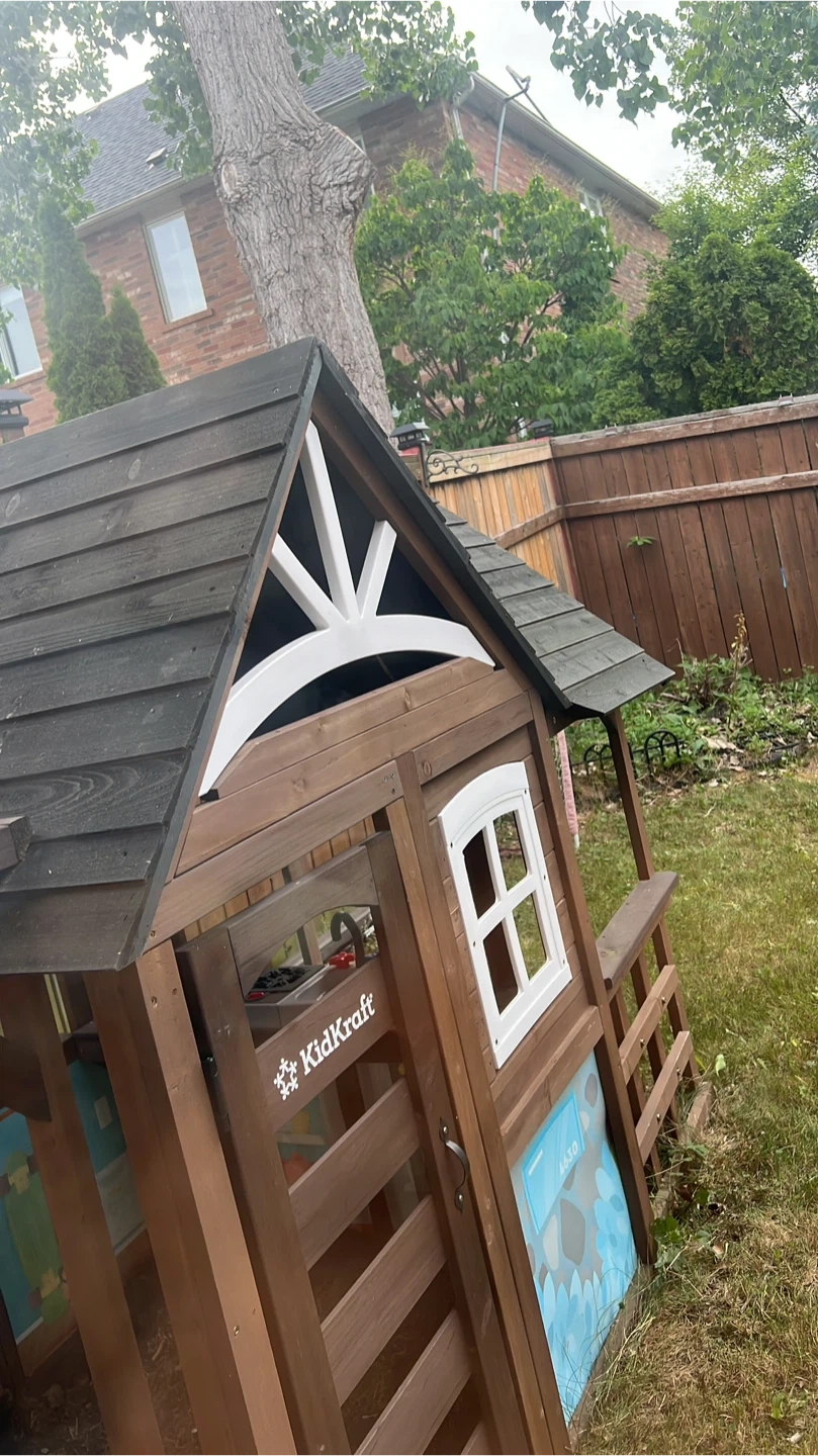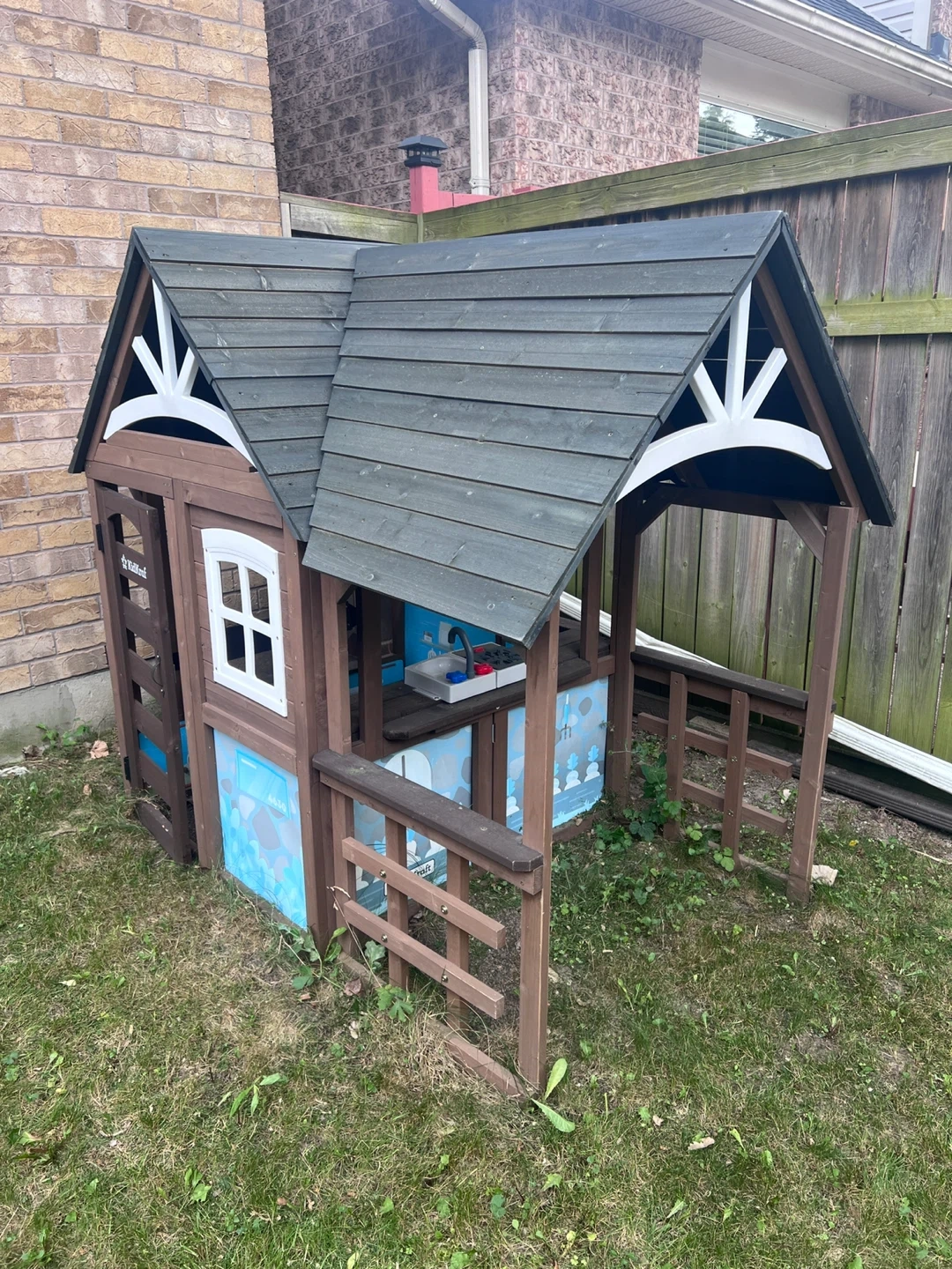Selling a gently used KidKraft playhouse. It's a fun outdoor space for kids to play and explore! The playhouse features a cute design with a door, window, and a small kitchen area inside. It's perfect for imaginative play and keeping the little ones entertained in the backyard.