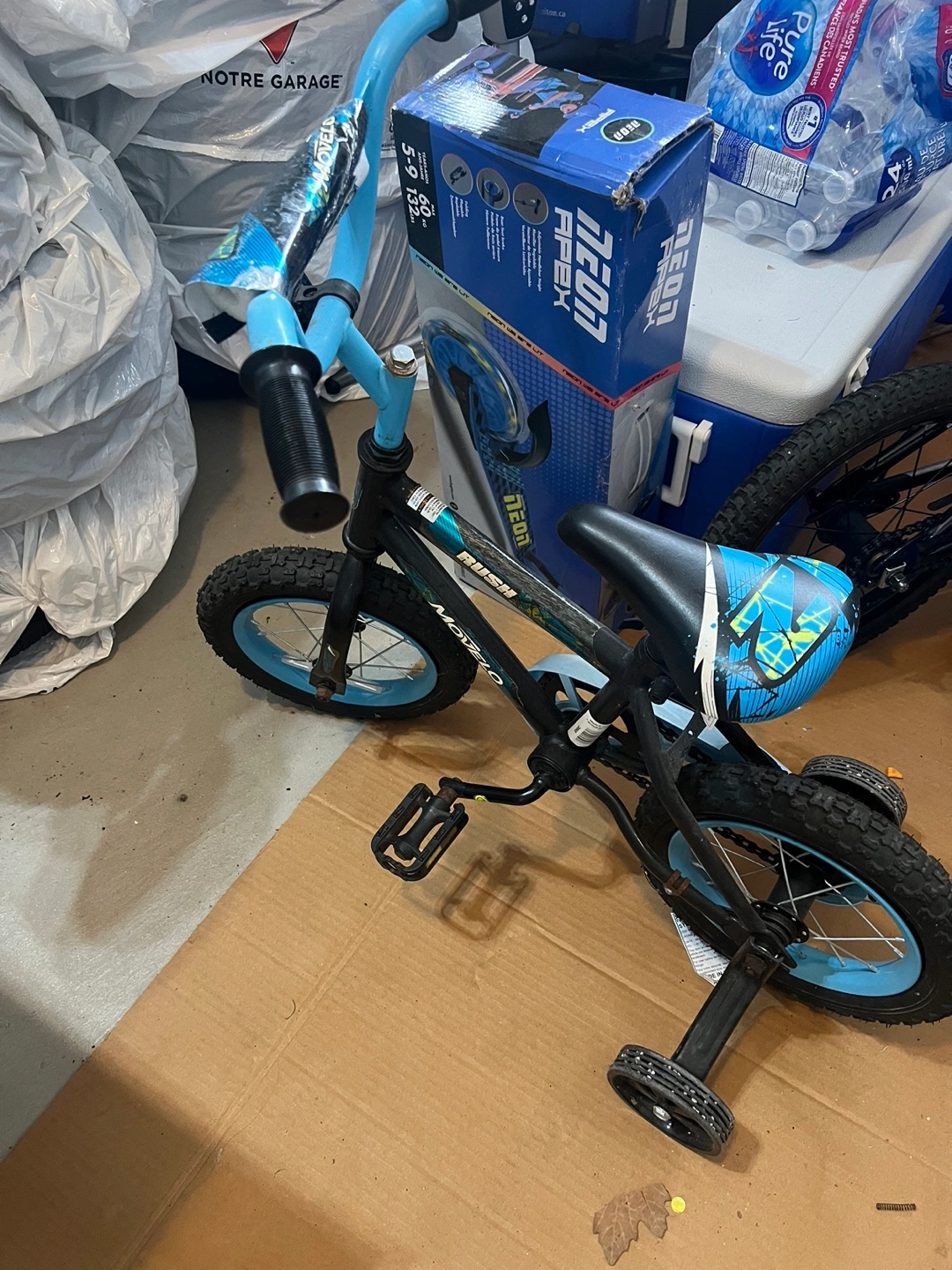 Blue and black kids' bicycle. Features training wheels. 12 inch wheels.