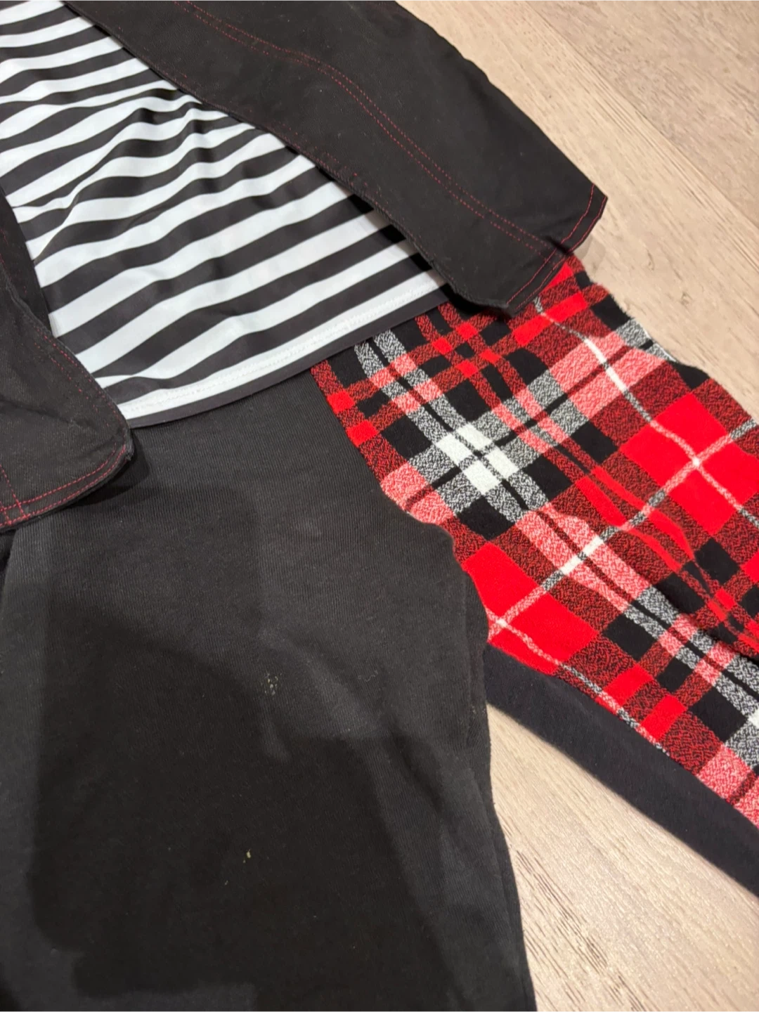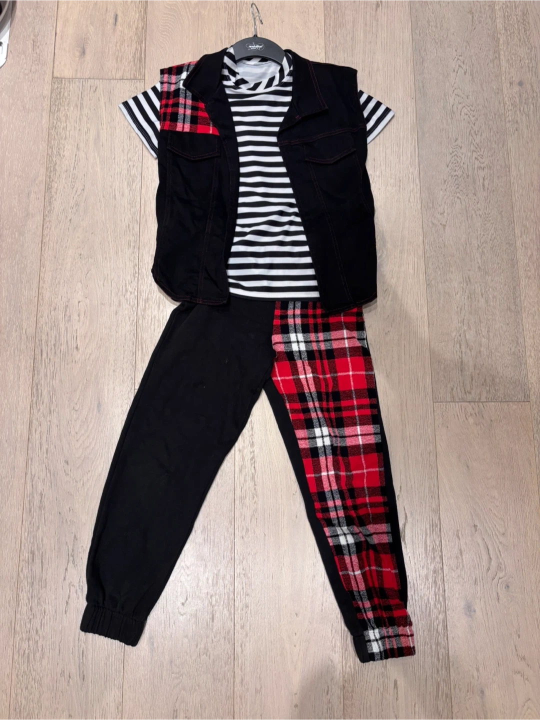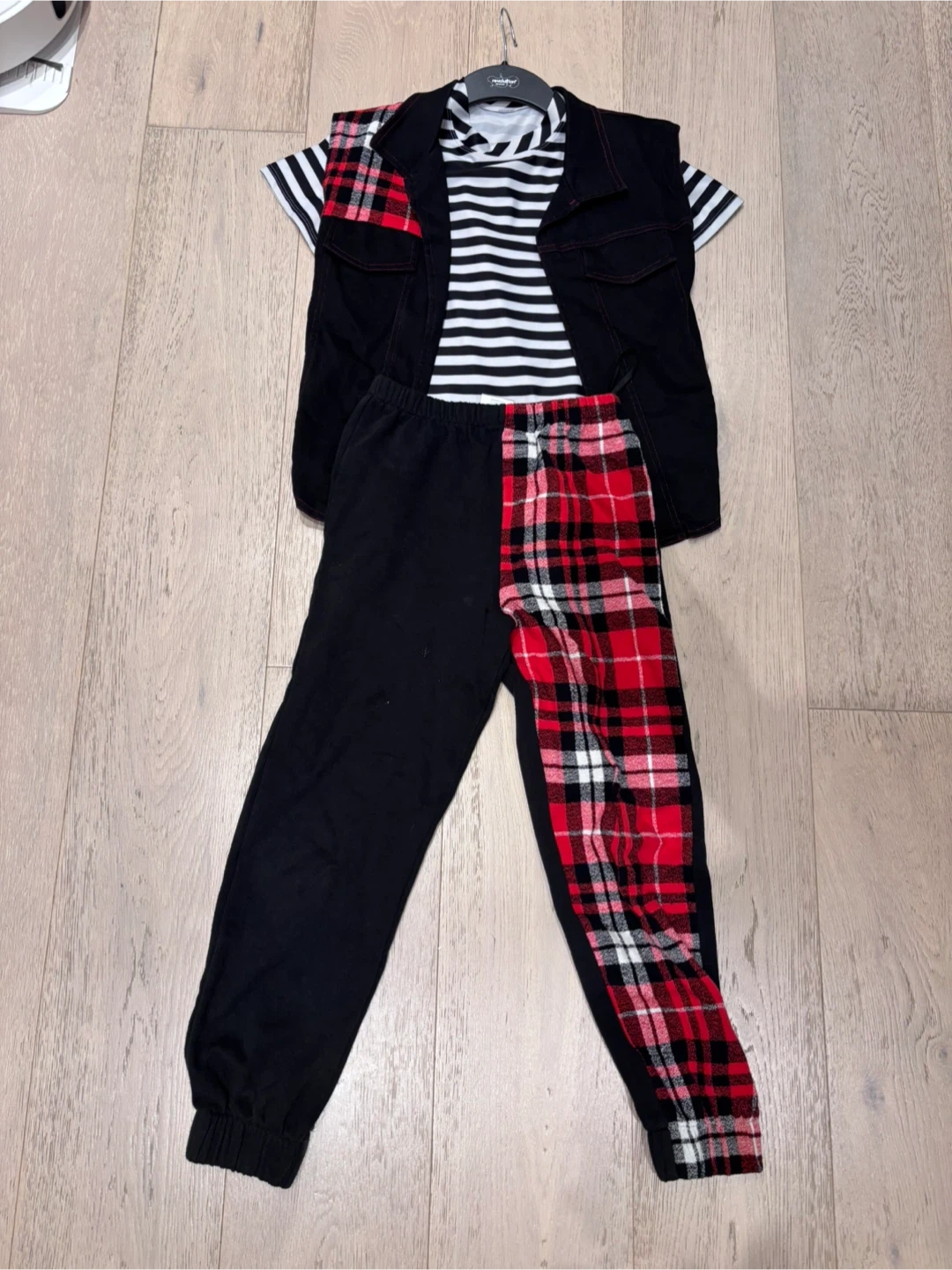 12Selling a cute three-piece outfit for kids! It includes a black vest with red stitching, a black and white striped top, and black pants with a red plaid accent on one leg. Perfect for a stylish and comfortable look! Clown costume Good for 8-10 yrs old
