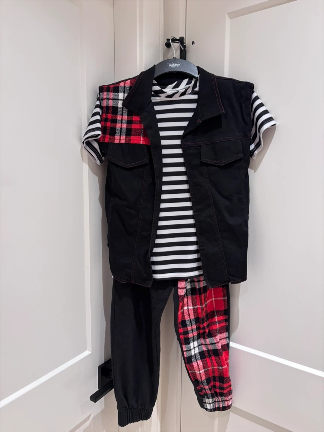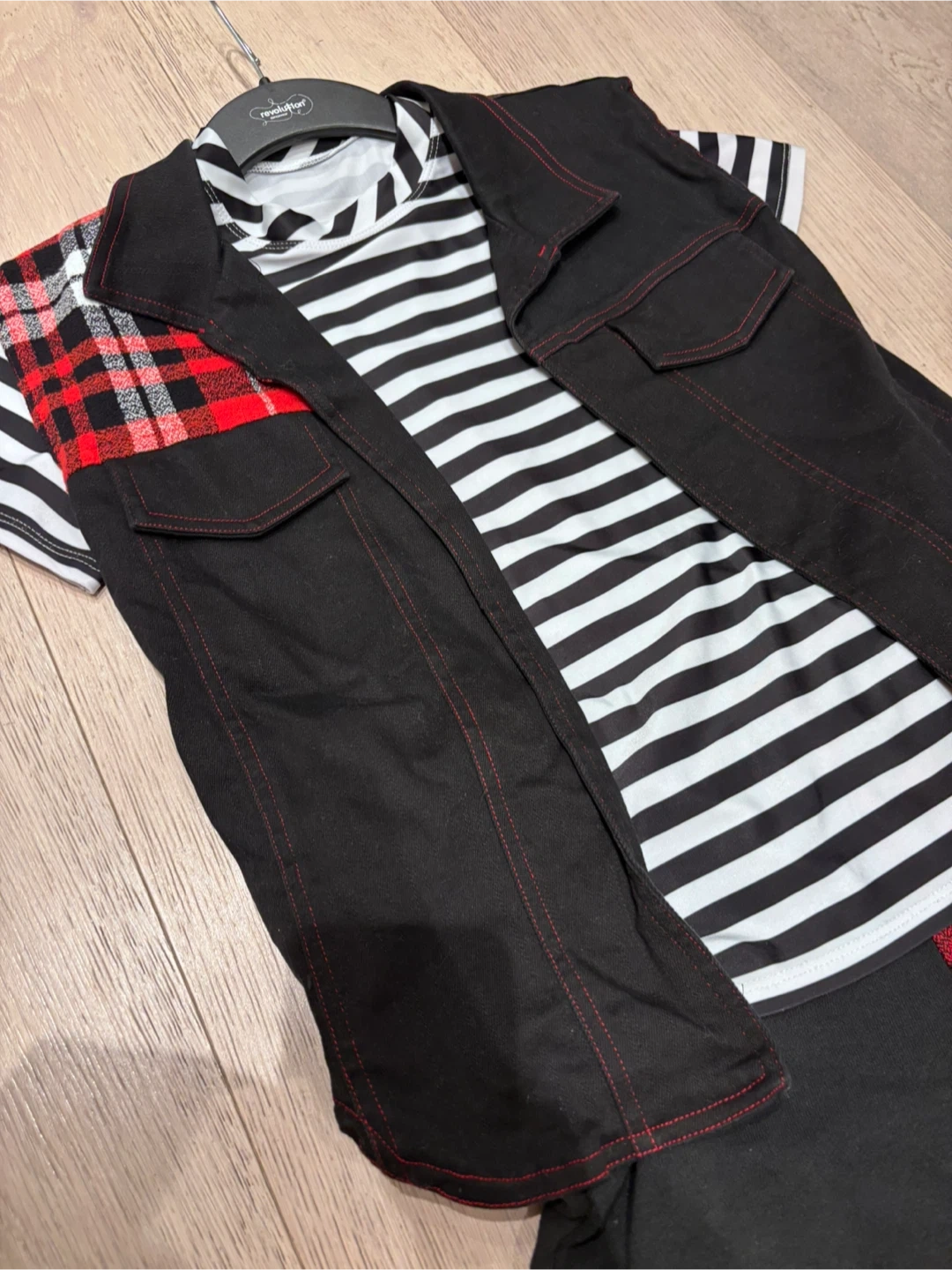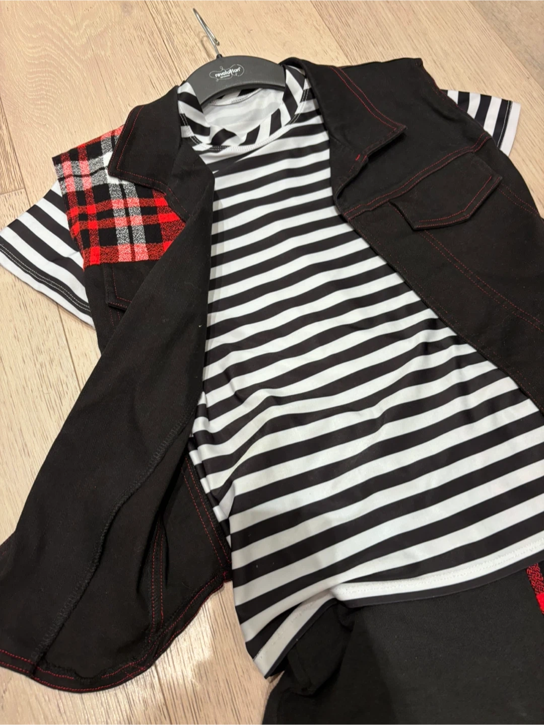 12Selling a cute three-piece outfit for kids! It includes a black vest with red stitching, a black and white striped top, and black pants with a red plaid accent on one leg. Perfect for a stylish and comfortable look! Clown costume Good for 8-10 yrs old