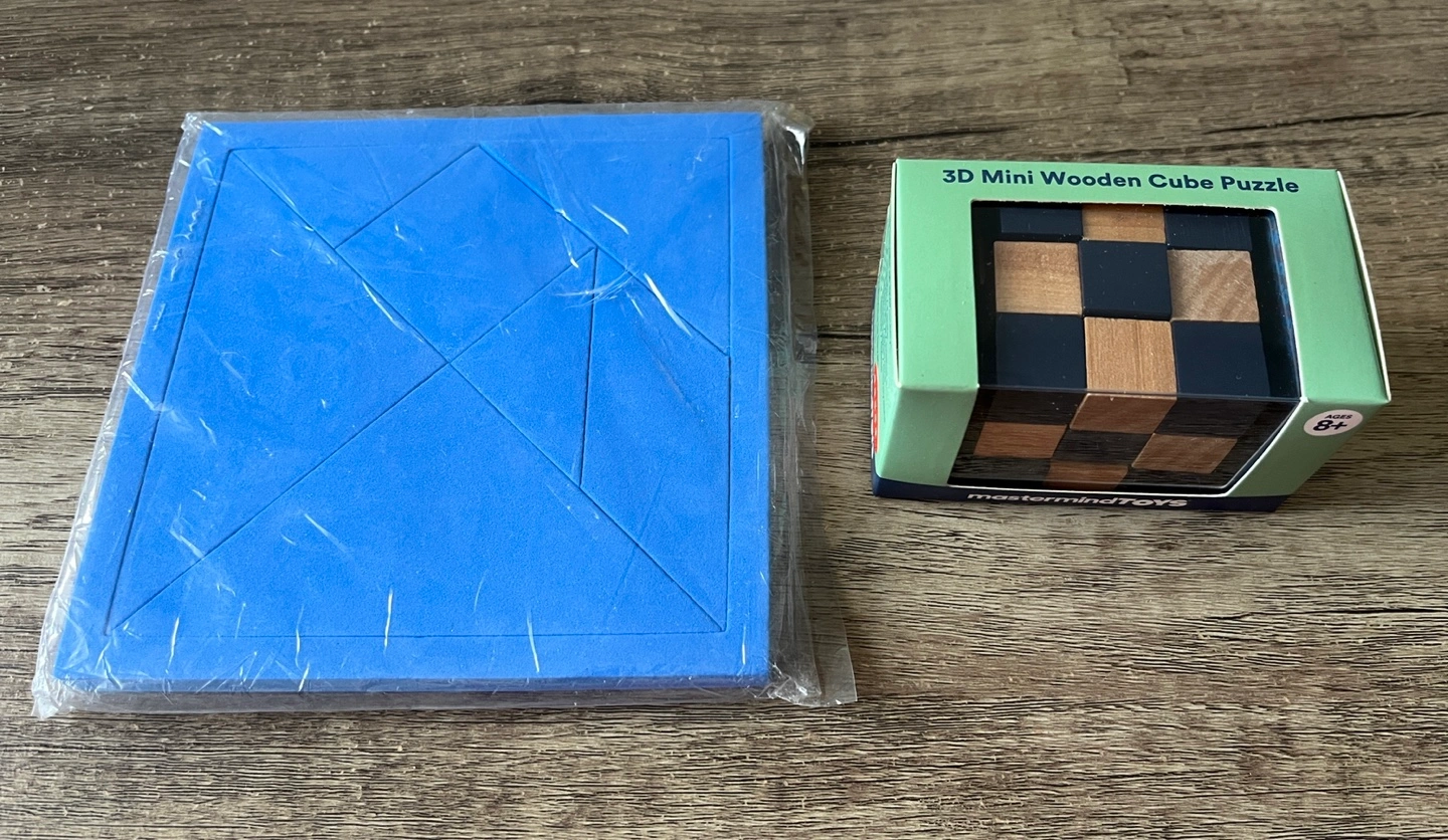 Take both for $3. 3D wooden cube and tangram puzzles.