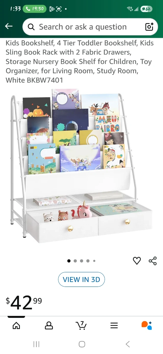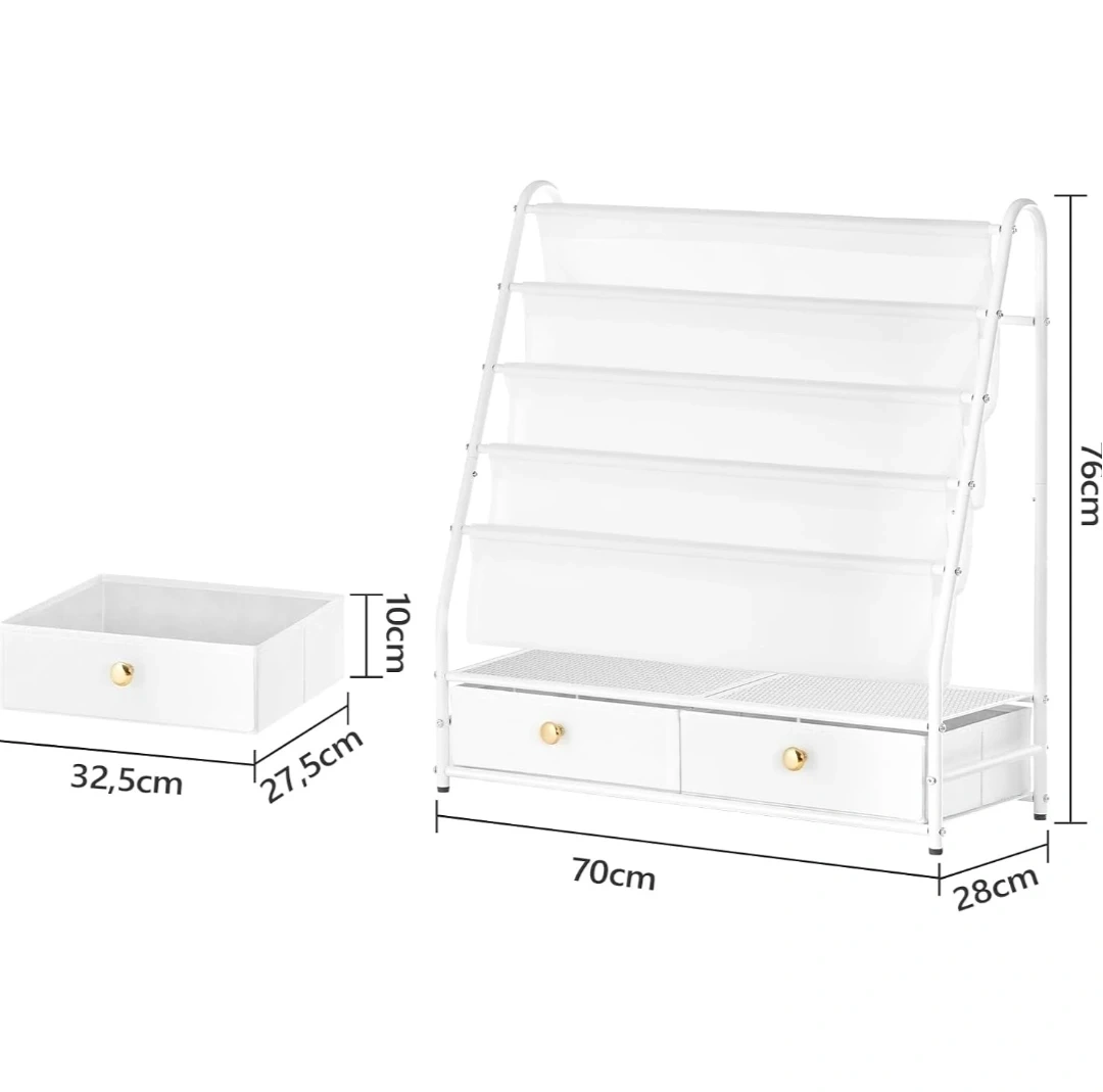 93Looking to organize your little one's books and toys? This 4-tier toddler bookshelf is perfect! It features a sling book rack and two fabric drawers for extra storage. The bookshelf is white and measures approximately 76cm in height, 70cm in width, and 28cm in depth. The drawers are about 32.5cm wide, 27.5cm deep, and 10cm high. It's a great addition to any nursery, living room, or study room!