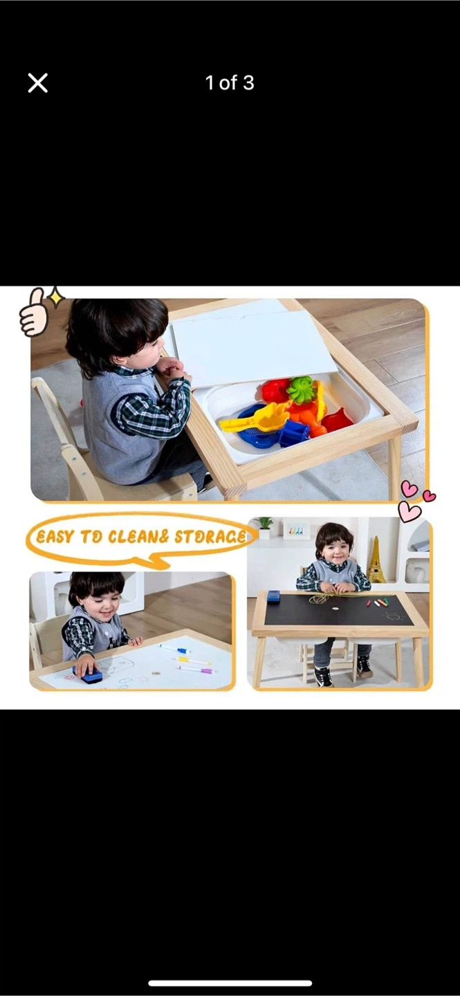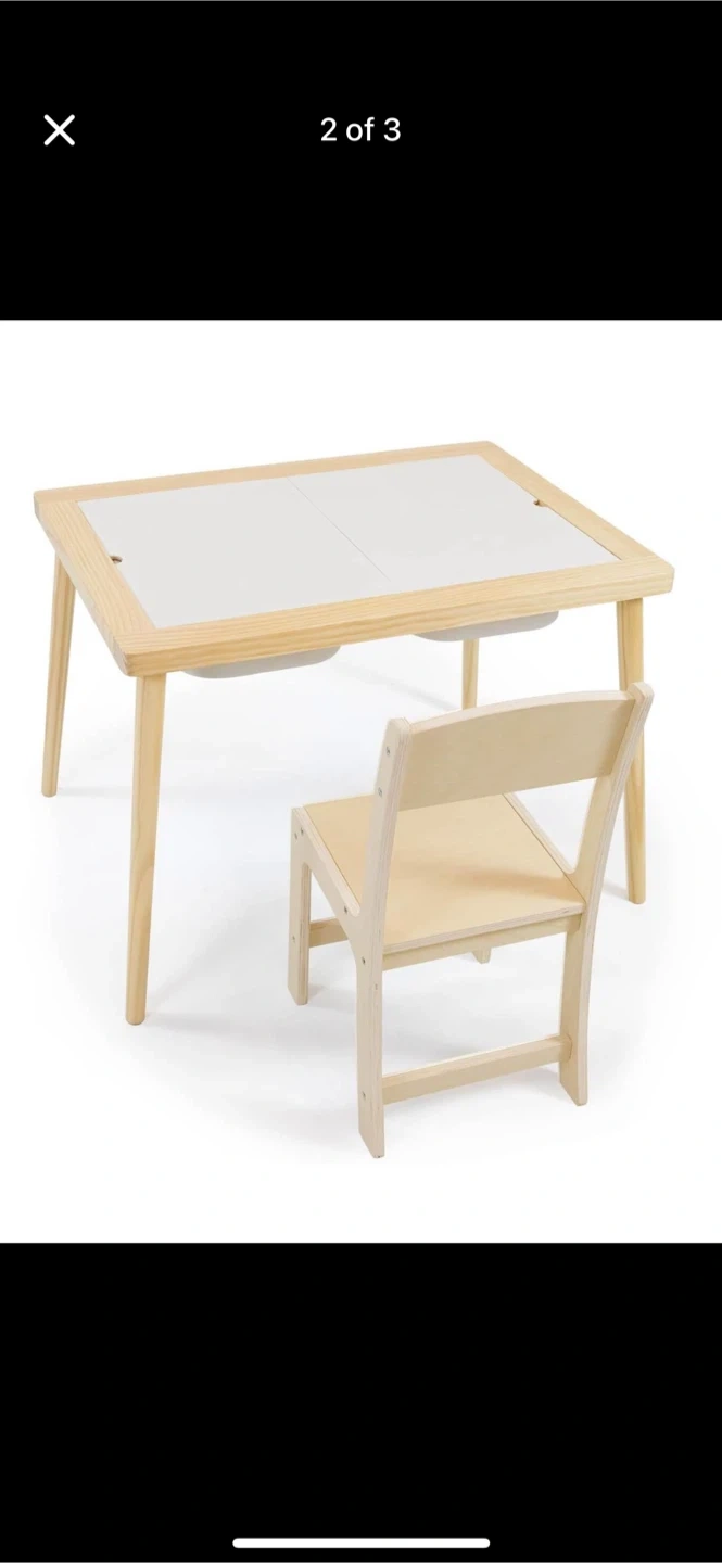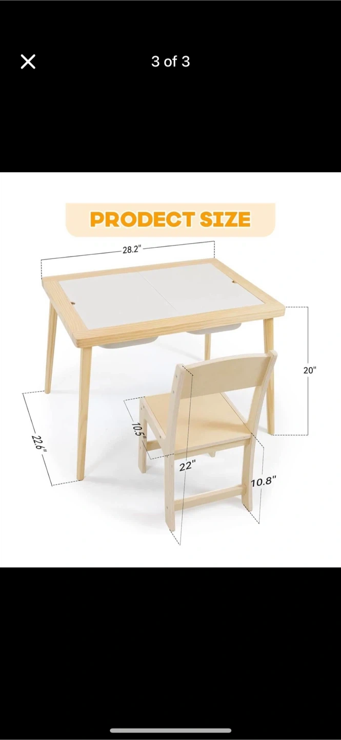 76This is a cute activity table and chair set for kids. The table dimensions are approximately 28.2" x 22.5" x 20". The chair dimensions are approximately 10.5" x 10.8" x 22". It features easy to clean and storage. New Price is firm VERSATILE CHILDREN'S TABLE】Our table serves as a versatile piece of furniture for kids, functioning as a dining table, desk, and activity station. Children can enjoy meals, snacks, reading, drawing, building blocks, crafting, homework, and board games, fostering happy moments. Ideal for playrooms, daycares, and preschools. 【PREMIUM WOOD CONSTRUCTION】Crafted from high-quality natural pine wood, our table ensures a healthy and eco-friendly environment. Its sturdy construction resists deformation, providing long-lasting durability to support children's growth. With superior craftsmanship and solid wood quality, this table enhances children's learning and play experiences. 【SECURE & STURDY DESIGN】Our wooden table features rounded and polished edges to prevent bumps and ensure child safety. Its robust structure and square legs offer strong load-bearing capacity, stability, and protection. Certified to meet and exceed US safety standards, guaranteeing peace of mind for parents. 【COMPLETE SET】Includes one table measuring 28" x 23" x 20", equipped with 1 large bin and 2 small bins in white, along with a pine chair.