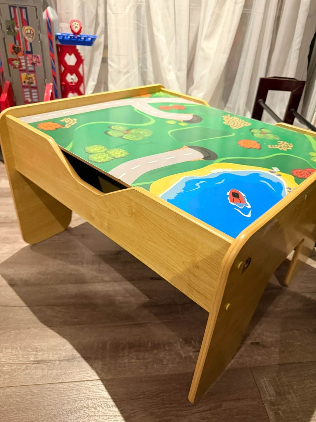 53Selling a gently used kids activity table! It features a colourful play surface with roads, trees, and a lake design. There's also a storage compartment underneath to keep toys and art supplies organized. Perfect for arts and crafts, puzzles, or playtime!