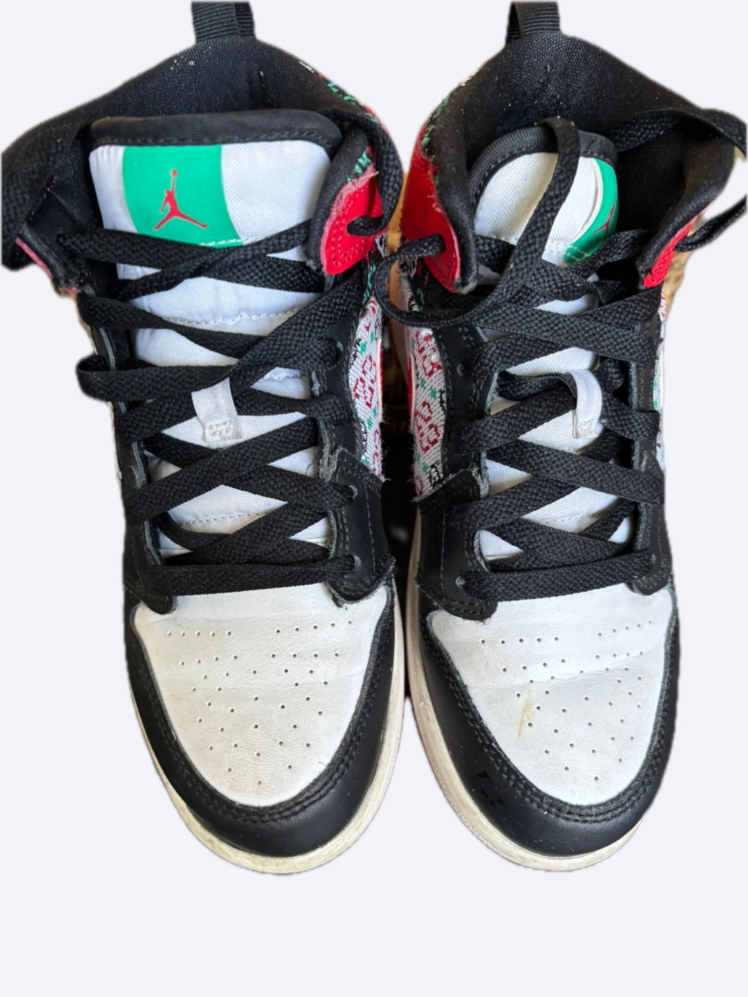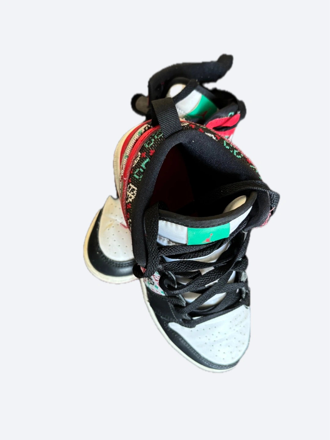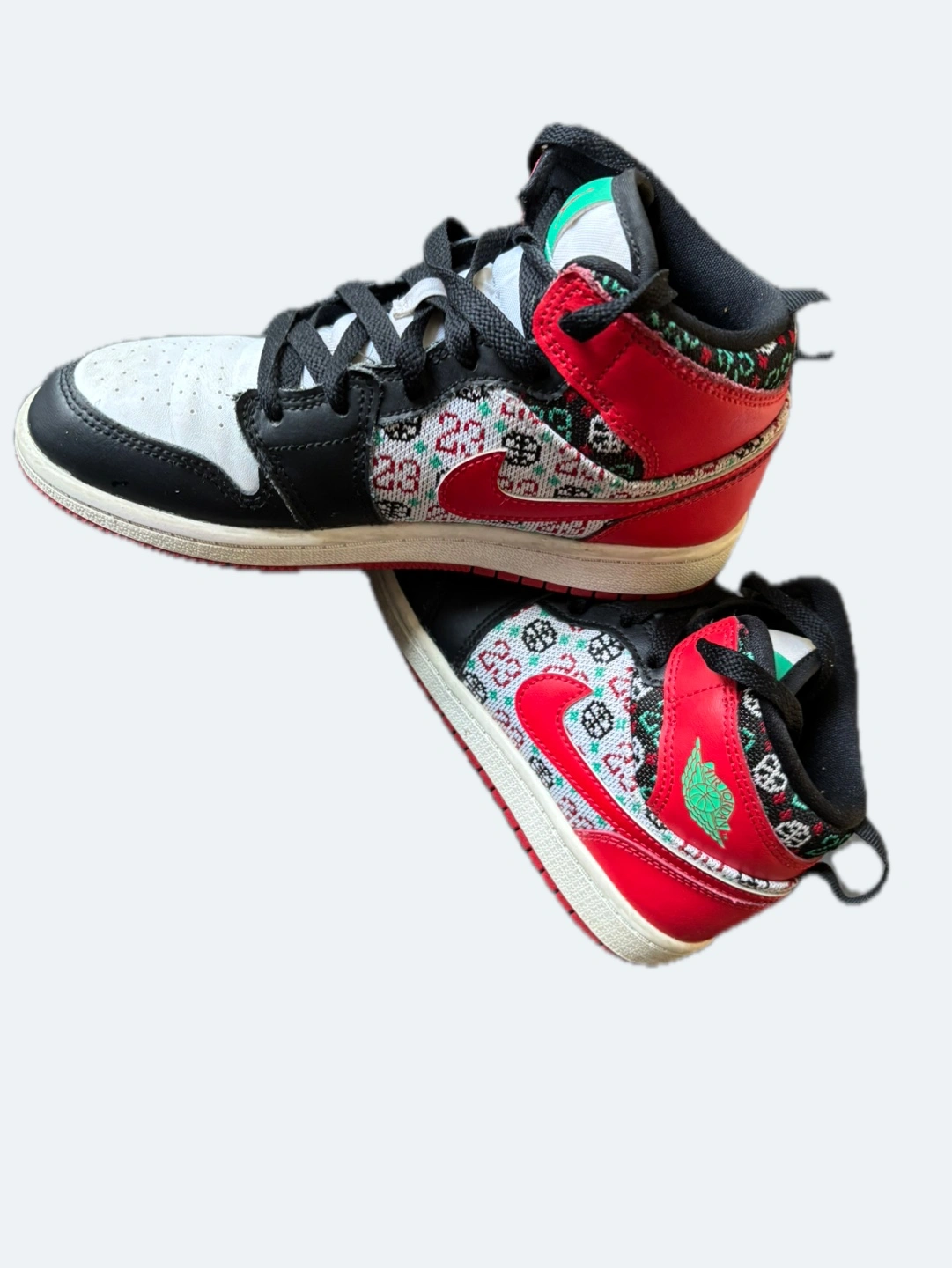 89Pre-owned Air Jordan 1 Mid SE sneakers. Black, red, white, and green colour scheme. Festive-themed design. High-top style. Lace-up closure.