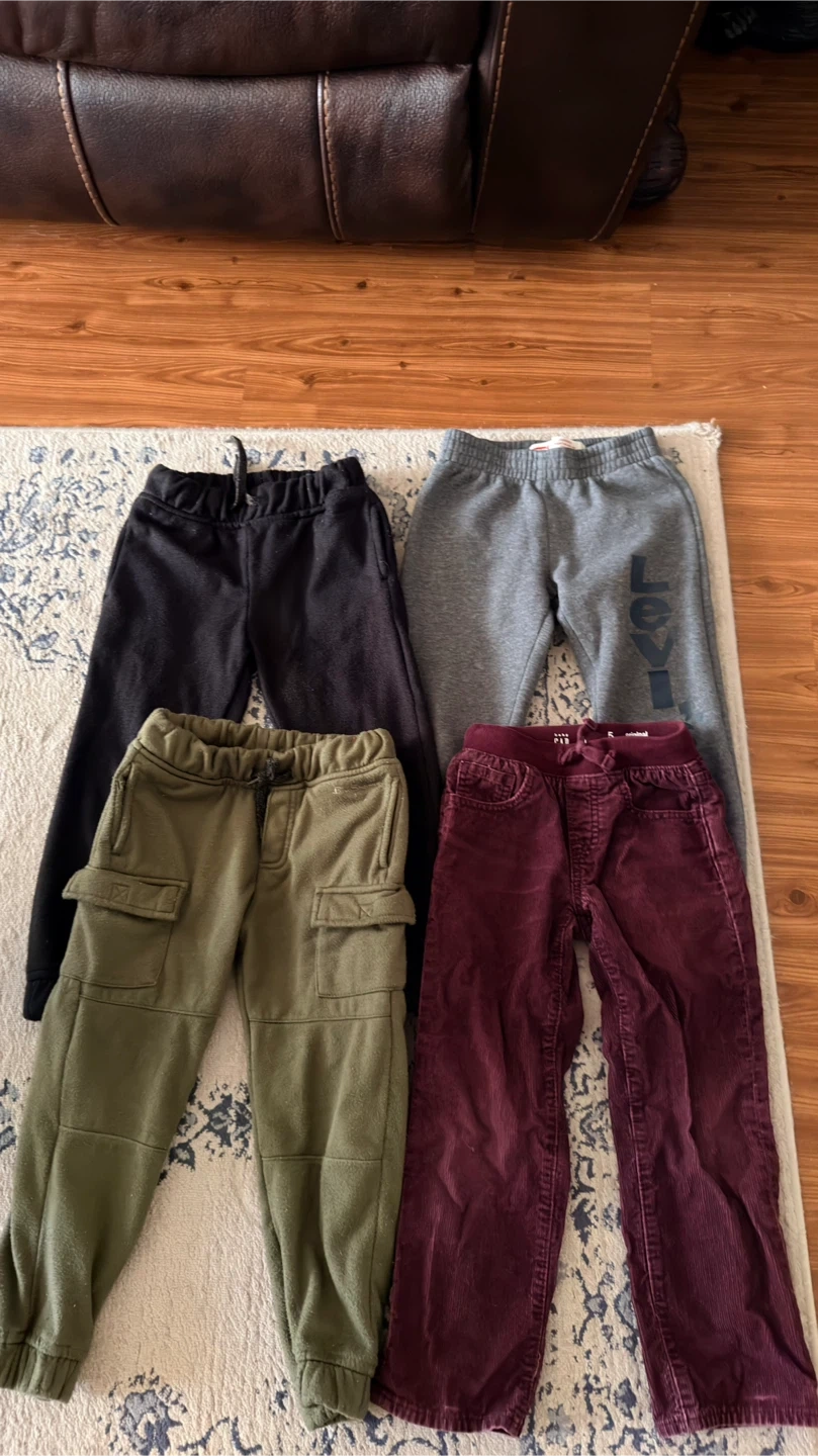 92This is a set of assorted kids' pants, perfect for everyday wear. The bundle includes a pair of black sweatpants, grey Levi's sweatpants, green cargo pants, and burgundy corduroy pants Gap. All items are in used condition but have plenty of life left. * Black Sweatpants * Grey Levi's Sweatpants * Green Cargo Pants * Burgundy Corduroy Pants Gap These pants are priced to sell, offering great value for a variety of styles! Smoke free and pets free home. I can also sell it separately. Pm me for details! If the ad is up, the pants are available! Only available for pick up