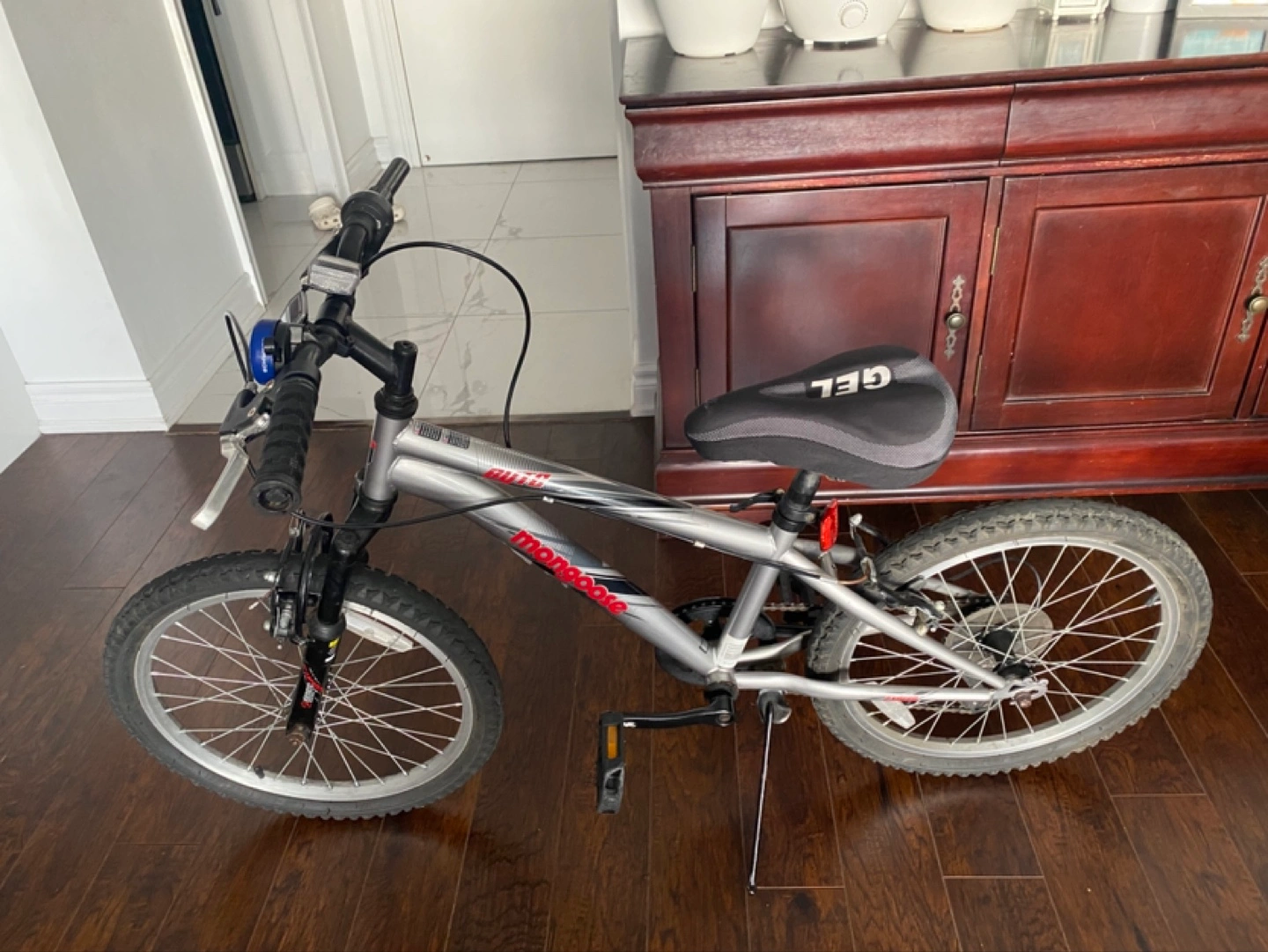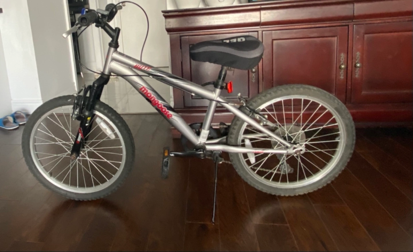 Used kids bike. Silver frame, black components. Includes bell and kickstand. Suitable for younger riders.