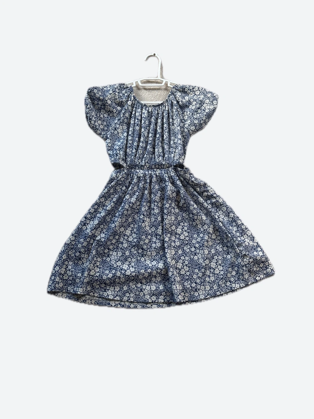 15A cute blue dress with a white floral print! It features short sleeves and a gathered waist. Perfect for a sunny day out or a casual event