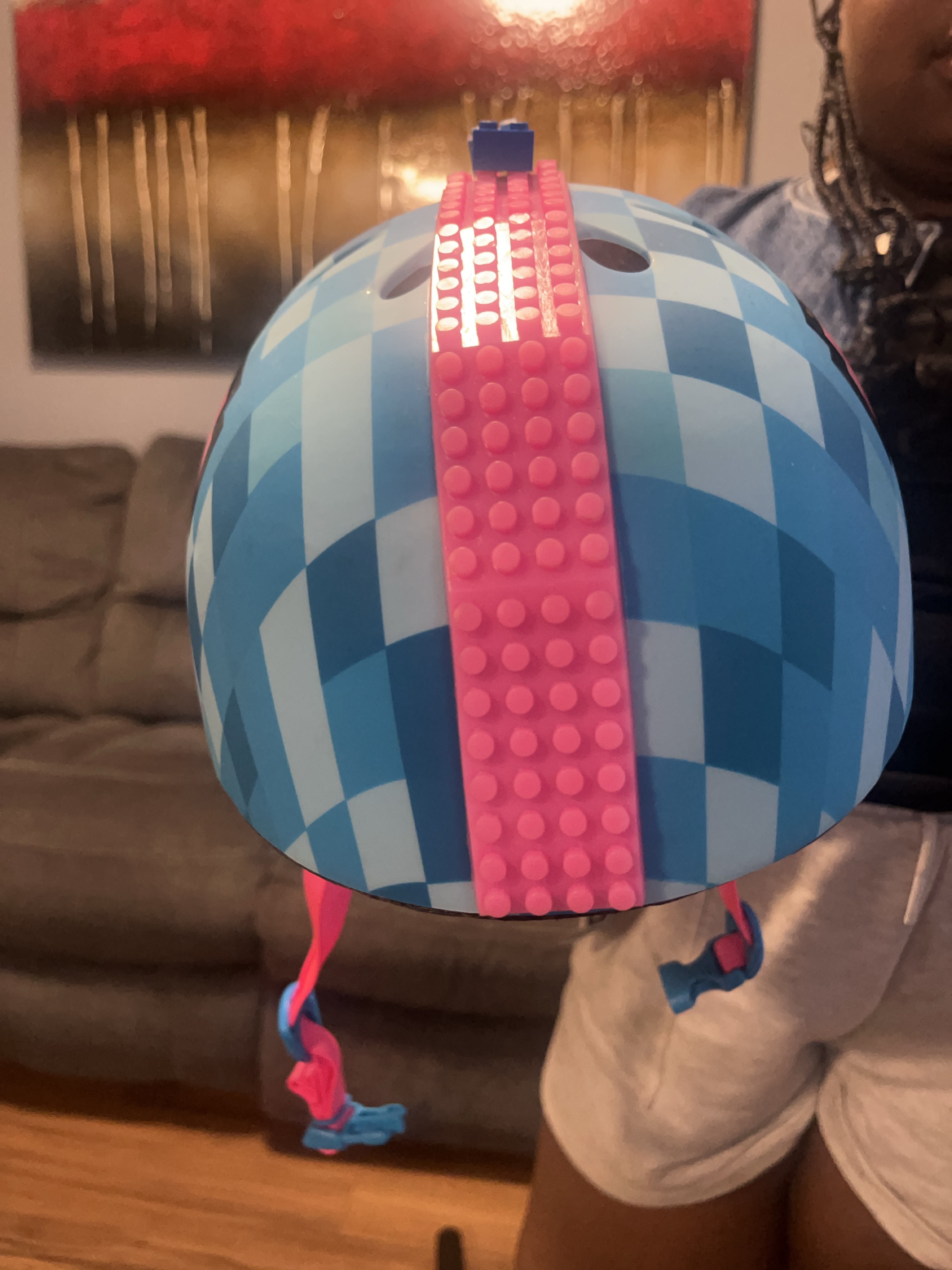 41Selling a fun kids' helmet featuring a blue and white checkered pattern and a pink Lego-style strip on top. Perfect for biking or skating!