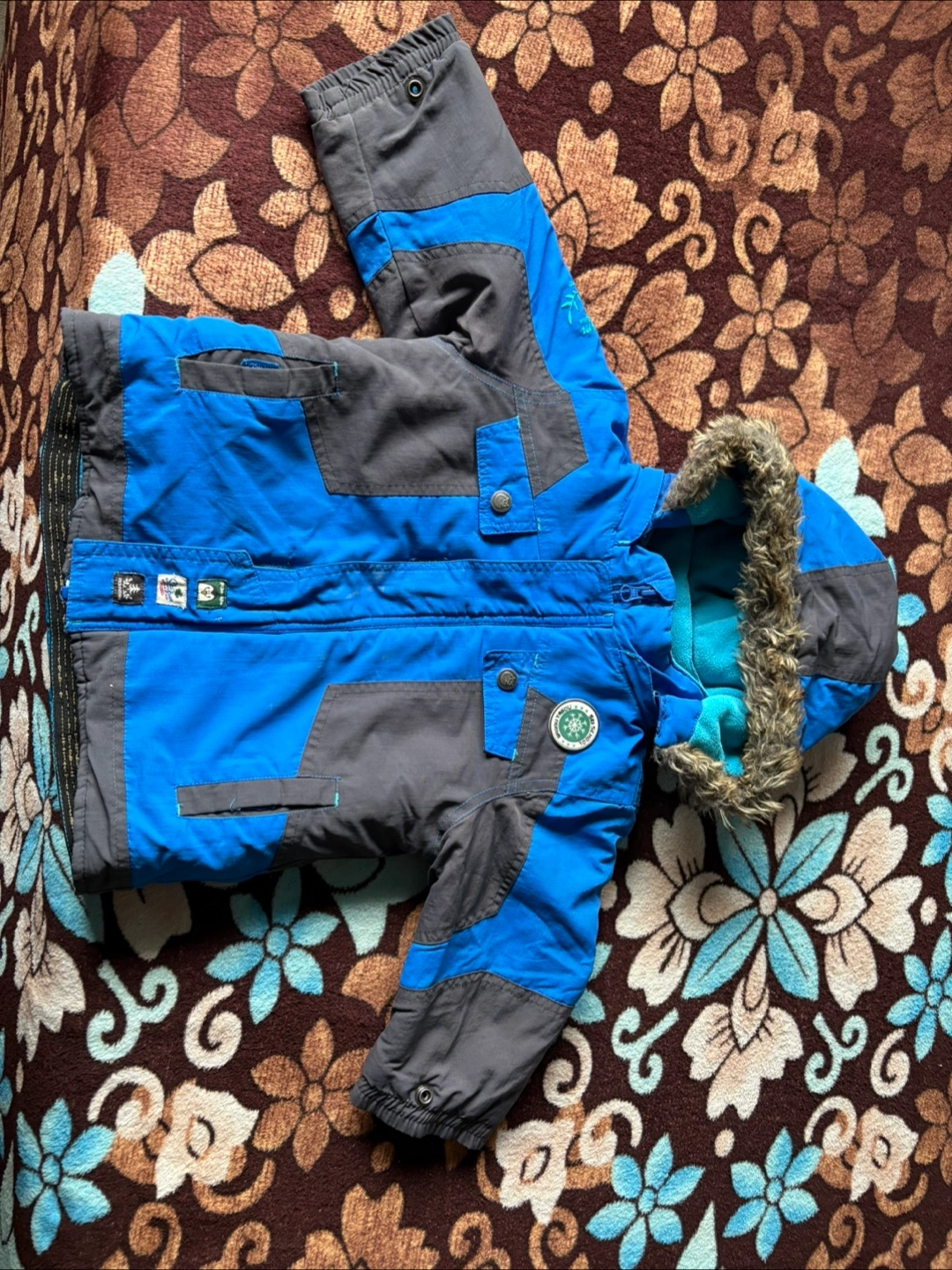 A cozy blue winter jacket for your little one! This jacket is perfect for keeping your child warm during cold weather. It features a hood with faux fur trim and a soft, insulated lining. Size is 24 months