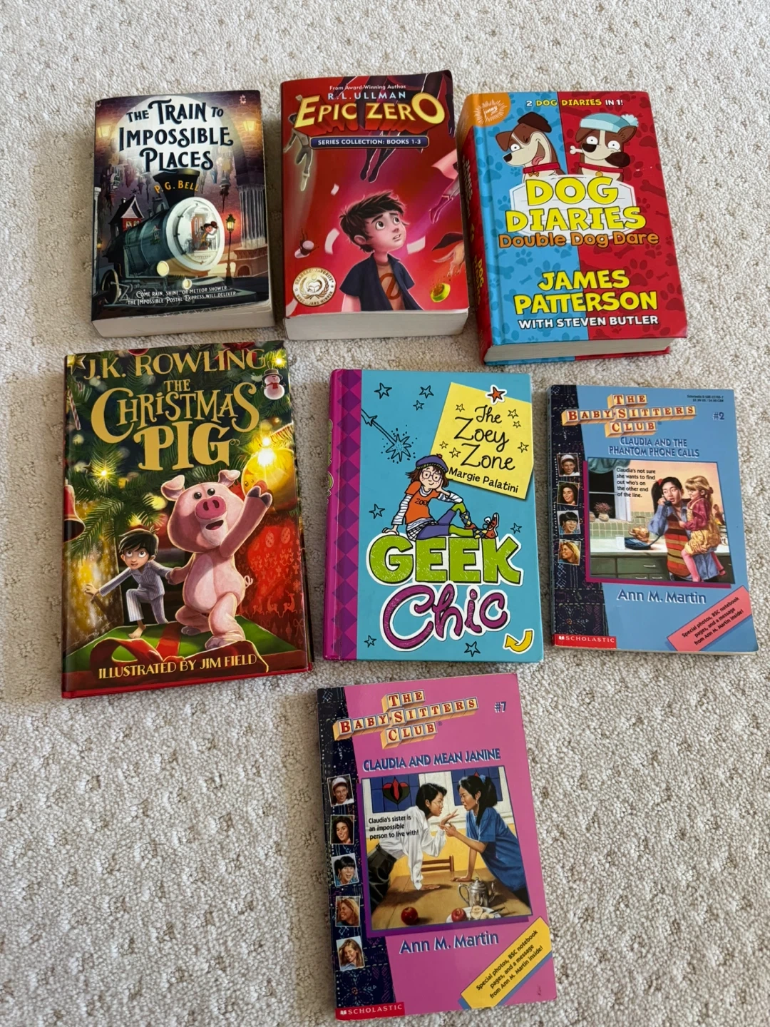 24Selling a bundle of kids' books! Includes: - The Train to Impossible Places by P.G. Bell - Epic Zero Series Collection: Books 1-3 by R.L. Ullman - Dog Diaries Double Dog-Dare by James Patterson with Steven Butler - The Christmas Pig by J.K. Rowling - The Zoey Zone: Geek Chic by Margie Palatini - The Baby-Sitters Club #2: Claudia and the Phantom Phone Calls by Ann M. Martin. $1 - The Baby-Sitters Club #7: Claudia and Mean Janine by Ann M. Martin. $1 $5 each except the baby sitters club or take all for $30.