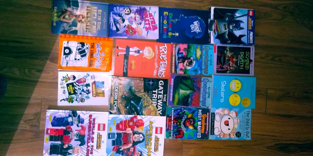 Selling a collection of kids' books in good condition! This lot includes a variety of titles, such as: - Lego Super Heroes and Super-Villains books - Goosebumps series - Diary of a Wimpy Kid: The Long Haul - Inside Out - Sisters - The Odd 1s Out - And more!