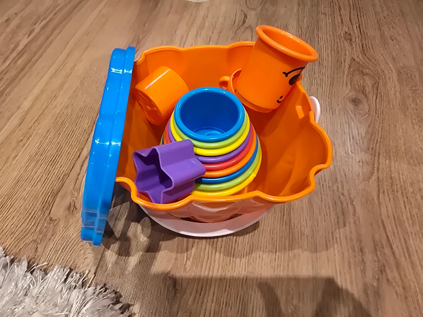 A fun bucket of toys for the little ones! Includes stacking cups in rainbow colours and some cute shapes. Perfect for sensory play and developing fine motor skills