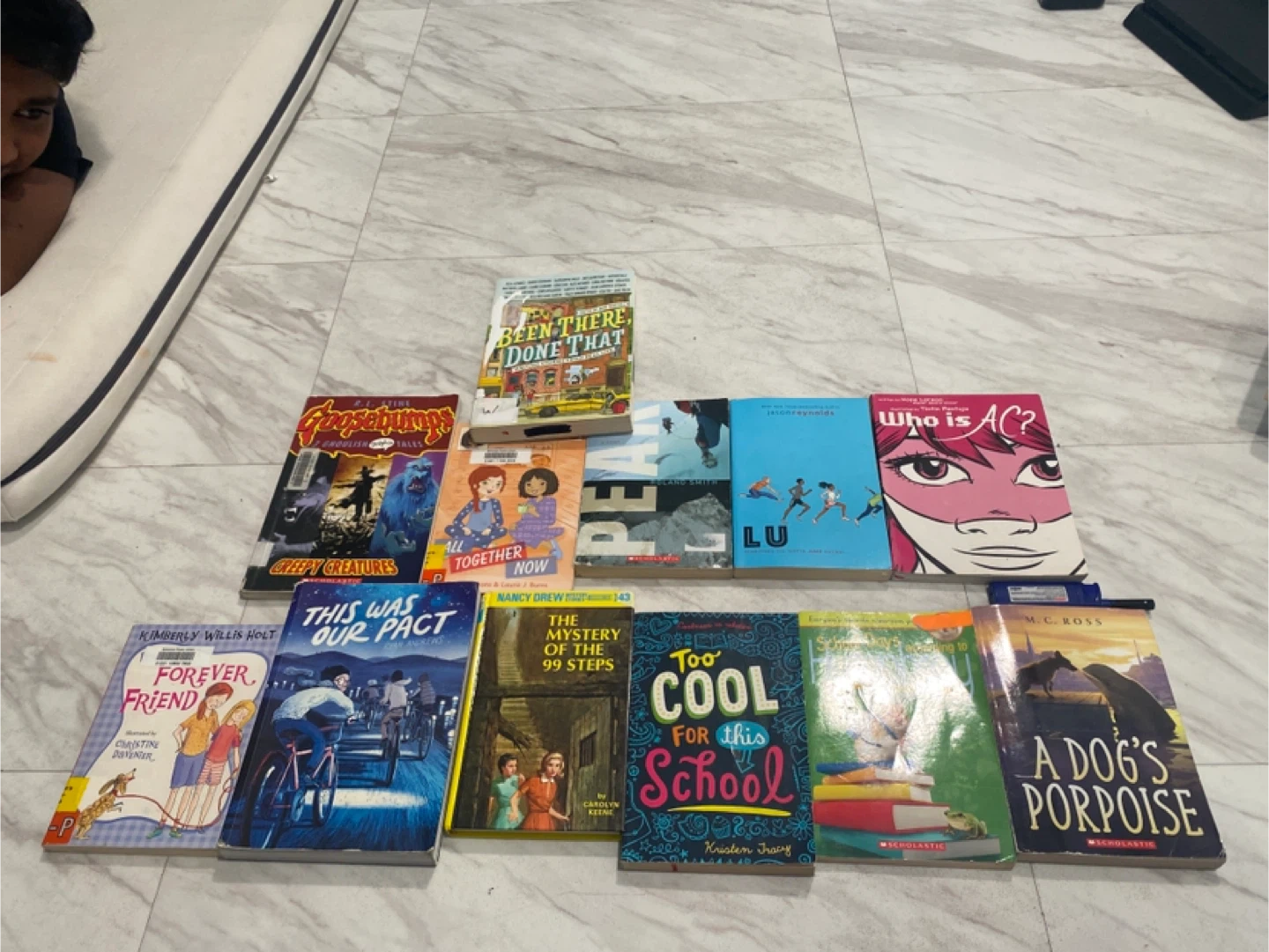 25Selling a collection of chapter books for kids! Titles include: - Goosebumps: Creepy Creatures - Been There Done That - Together Now (Nancy Drew) - Lu - Who Is AC? - Forever Friend - This Was Our Pact - The Mystery of the 99 Steps (Nancy Drew) - Too Cool for This School - A Dog's Porpoise