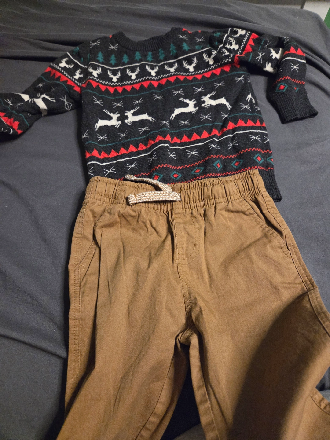 0Selling a cute kids' outfit! It includes a sweater with a festive reindeer pattern and a pair of comfortable brown pants. Size 3T. good condition worn once. Delivery might be possible.