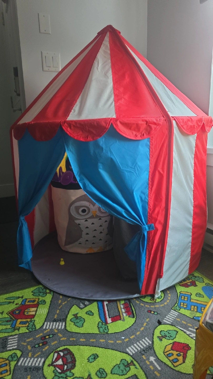 A cute circus tent for kids! It's in great shape and ready for lots of fun playtime adventures. The tent features a red and white striped top with blue curtains. Perfect for indoor or outdoor use!