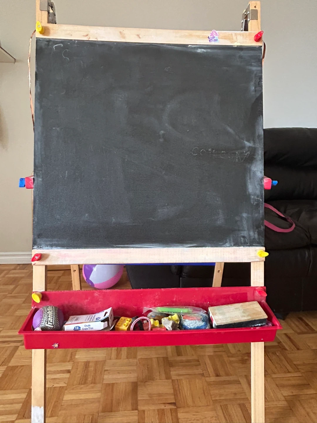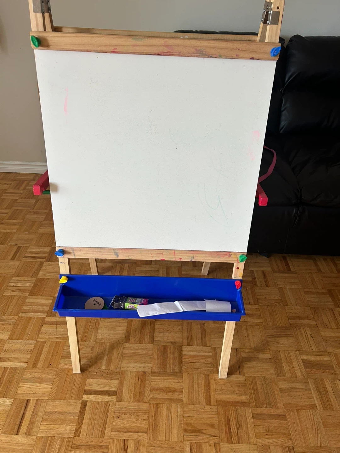 Selling a kids easel with both a chalkboard and a whiteboard surface! It's got a little tray underneath for storing art supplies too. Perfect for sparking creativity!