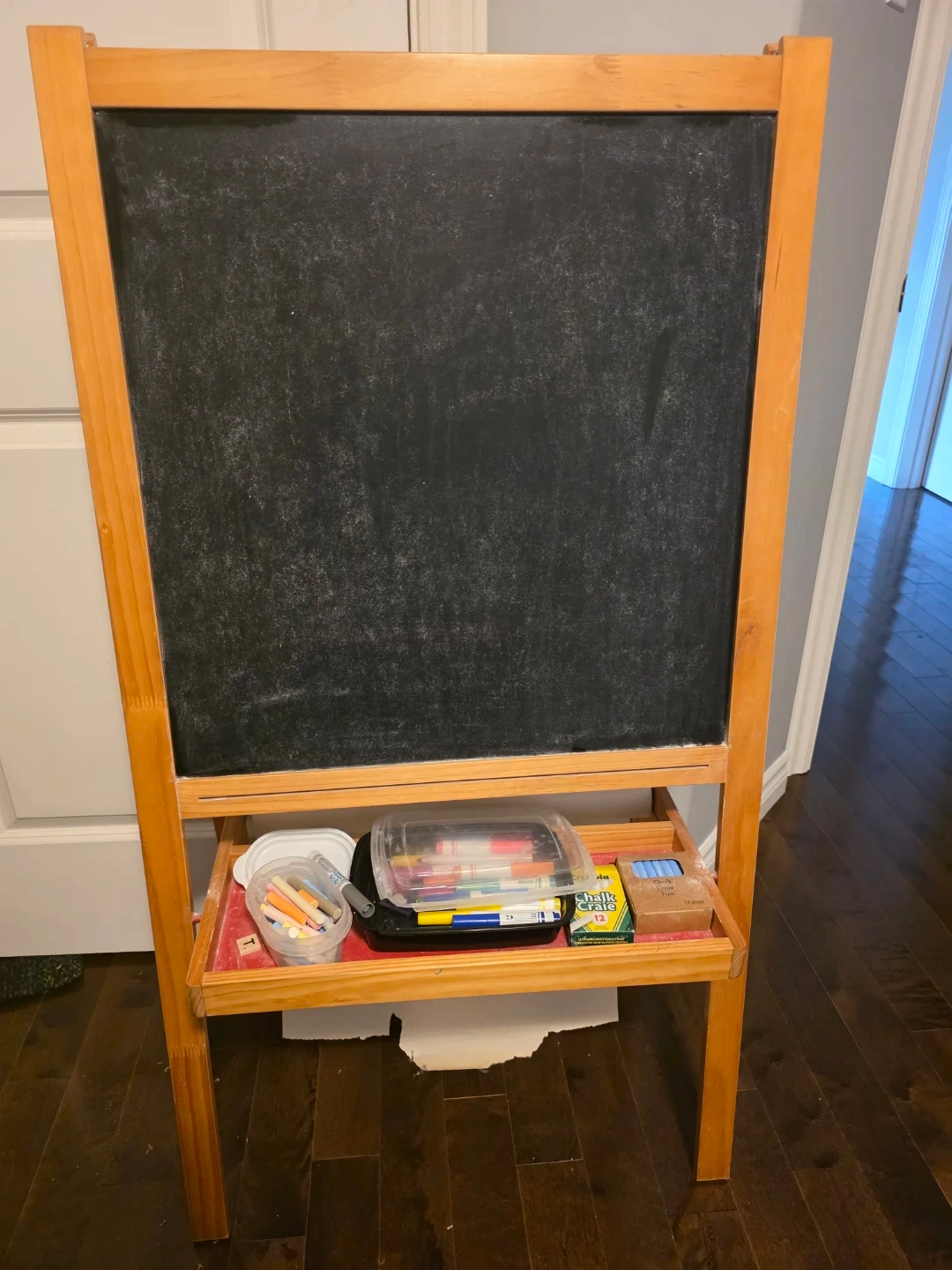10Looking to pass along this easel that's perfect for kids! It features both a chalkboard on one side and a whiteboard on the other, offering lots of creative options. It also has a handy shelf for storing chalk, markers, and other art supplies. A great way to encourage your little one's artistic talents!Also has boxes of white and colored chalk and a roll of paper for art work.
