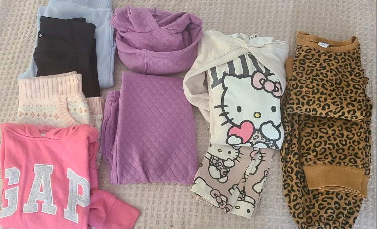 21Selling a bundle of kids' clothing: - A pink GAP hoodie (size 8) - A Hello Kitty set from H&M and Sanrio (size 8-9) - Purple cropped jogging suit set George (size 7-8) - Leopard print pj's Old Navy (size 8) - Old Navy Active Powersoft cropped tights (size 6-7) - FWD blue joggers (M), Sport Chek - Multi/print pattern skirt (size 8)